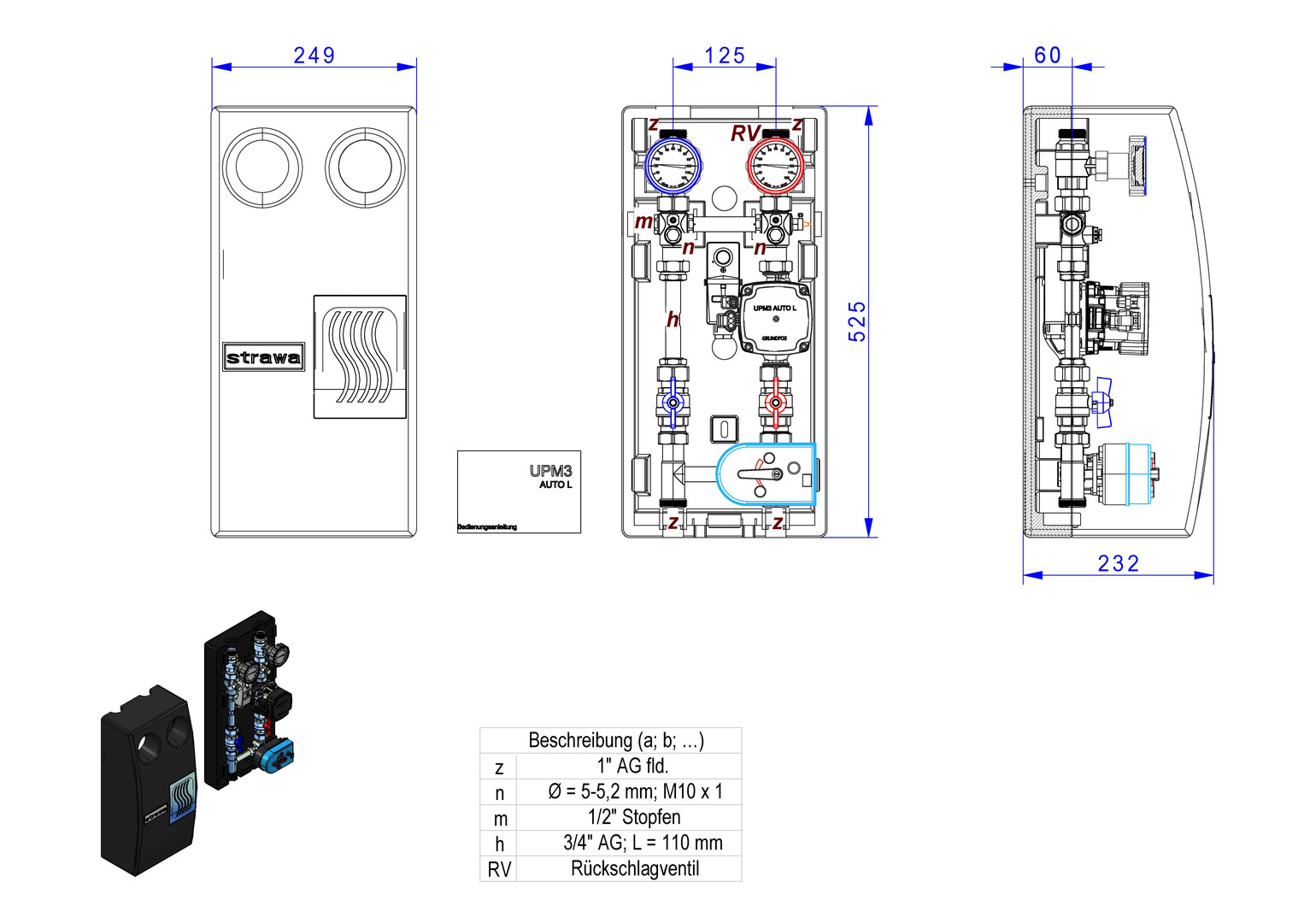 für festwertgeregelte Vorlauftemperaturregelung, passend auf strawi 125-25 Kesselverteiler, bestehend aus: Thermometer-Kugelhähnen DN 25 im Vor- und Rücklauf 0-120°C, zusätzliche Kugelhähne DN 25 im Vor- und Rücklauf (bei Wärmezählerverrohrung zusätzlicher Kugelhahn im Rücklauf), Rückschlagklappe im Vorlaufkugelhahn, mit oder ohne Wärmezählerverrohrung Länge 130 mm 2 x 1" AG oder Länge 110 mm, 2 x 3/4" AG und Fühlereinbaustücke 5-5,2mm M10x1 im Vor- und Rücklauf montiert, Pumpendistanzstück bzw. Pumpe, 3-Wege-Mischer DN 25 Kvs= 10,75, mit Festwert-Stellmotor 230 V/24V, Einstellbereiche Temperatur (Einstellung DIP-Schalter am Stellmotor Festwertregler): Voreinstellung 0-100 °C, andere mögliche Einstellbereiche (25-45 °C mit allen Pumpentypen möglich, 20-70 °C und 60-85 °C nur mit Grundfos Pumpen UPM3 Auto und Alpha 2 möglich, mitgelieferter STB entfällt), zusätzlicher regulierbarer Bypass im Mischer, beigelegter Sicherheitstemperaturbegrenzer (STB) auf 60°C eingestellt, mit EPP-Wärmedämmung, max. Volumenstrom 0,86 cbm/h (10 kW, bei Delta T= 10 K, max. Betriebstemperatur 100°C, max. Betriebsdruck 6 bar, Stutzenabstand 125 mm, 249 x 525 x 232 mm, Primäranschluss 1"AG flachdichtend, Sekundäranschluss 1"AG flachdichtend