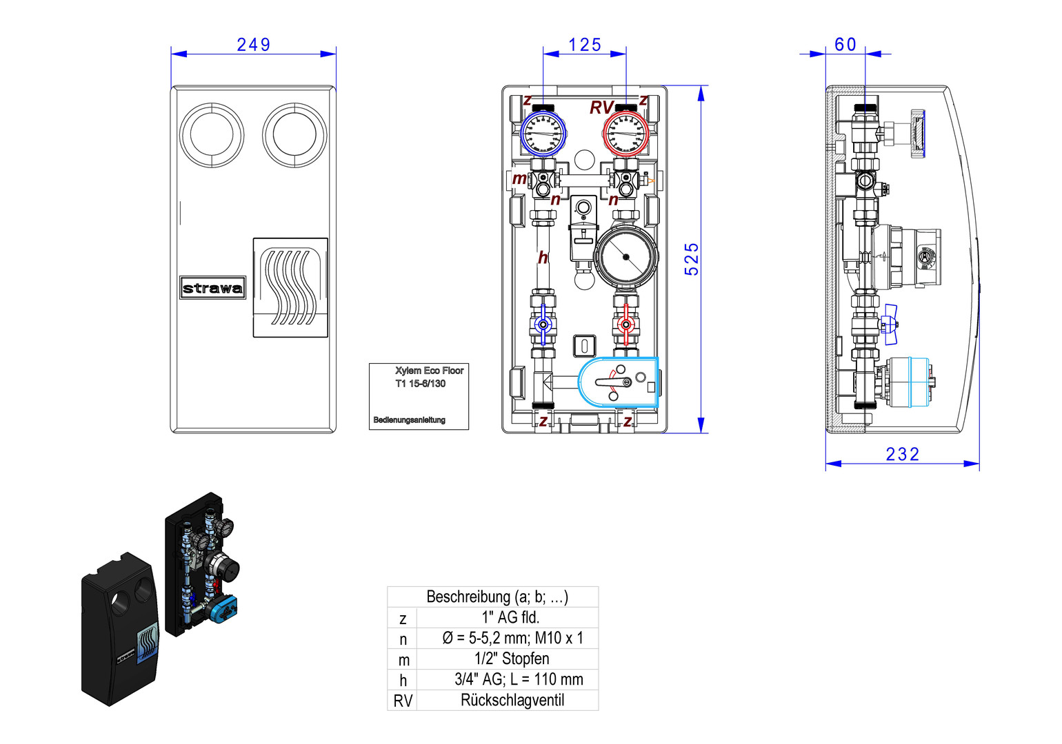 für festwertgeregelte Vorlauftemperaturregelung, passend auf strawi 125-25 Kesselverteiler, bestehend aus: Thermometer-Kugelhähnen DN 25 im Vor- und Rücklauf 0-120°C, zusätzliche Kugelhähne DN 25 im Vor- und Rücklauf (bei Wärmezählerverrohrung zusätzlicher Kugelhahn im Rücklauf), Rückschlagklappe im Vorlaufkugelhahn, mit oder ohne Wärmezählerverrohrung Länge 130 mm 2 x 1" AG oder Länge 110 mm, 2 x 3/4" AG und Fühlereinbaustücke 5-5,2mm M10x1 im Vor- und Rücklauf montiert, Pumpendistanzstück bzw. Pumpe, 3-Wege-Mischer DN 25 Kvs= 10,75, mit Festwert-Stellmotor 230 V/24V, Einstellbereiche Temperatur (Einstellung DIP-Schalter am Stellmotor Festwertregler): Voreinstellung 0-100 °C, andere mögliche Einstellbereiche (25-45 °C mit allen Pumpentypen möglich, 20-70 °C und 60-85 °C nur mit Grundfos Pumpen UPM3 Auto und Alpha 2 möglich, mitgelieferter STB entfällt), zusätzlicher regulierbarer Bypass im Mischer, beigelegter Sicherheitstemperaturbegrenzer (STB) auf 60°C eingestellt, mit EPP-Wärmedämmung, max. Volumenstrom 0,86 cbm/h (10 kW, bei Delta T= 10 K, max. Betriebstemperatur 100°C, max. Betriebsdruck 6 bar, Stutzenabstand 125 mm, 249 x 525 x 232 mm, Primäranschluss 1"AG flachdichtend, Sekundäranschluss 1"AG flachdichtend