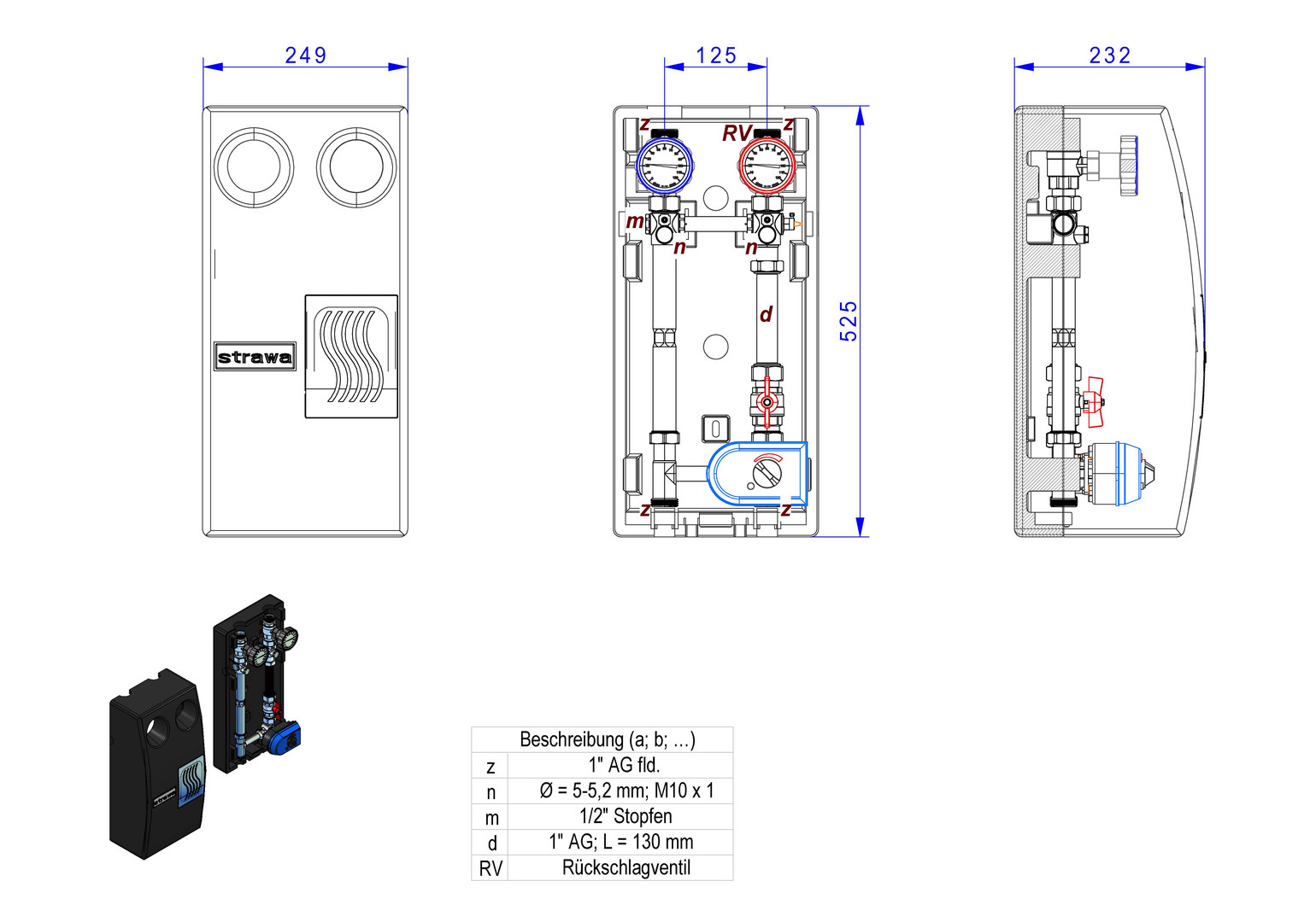 für geregelte Heizkreise (z.B. für Flächenheizung), für witterungsgeführte Vorlauftemperaturregelung (ohne Regler), passend auf strawi 125-25 Kesselverteiler, bestehend aus: Thermometer-Kugelhähnen DN 25 im Vor- und Rücklauf 0-120°C, zusätzlich mit Pumpenkugelhahn im Vorlauf (bei Wärmezählerverrohrung zusätzlicher Kugelhahn im Rücklauf), Rückschlagklappe im Vorlaufkugelhahn, mit oder ohne Wärmezählerverrohrung Länge 130 mm 2 x 1" AG oder Länge 110 mm 2 x 3/4" AG und Fühlereinbaustücke 5-5,2mm M10x1 im Vor- und Rücklauf montiert, Pumpendistanzstück bzw. Pumpe. 3-Wege-Mischer DN 25 Kvs=10,75, zusätzlicher regulierbarer Bypass im Mischer mit EPP-Wärmedämmung, max. Volumenstrom 0,86 cbm/h (10 kW, bei Delta T= 10 K, max. Betriebstemperatur 100°C, max. Betriebsdruck 6 bar, Stutzenabstand 125 mm, 249 x 525 x 232 mm, Primäranschluss 1"AG flachdichtend, Sekundäranschluss 1"AG flachdichtend