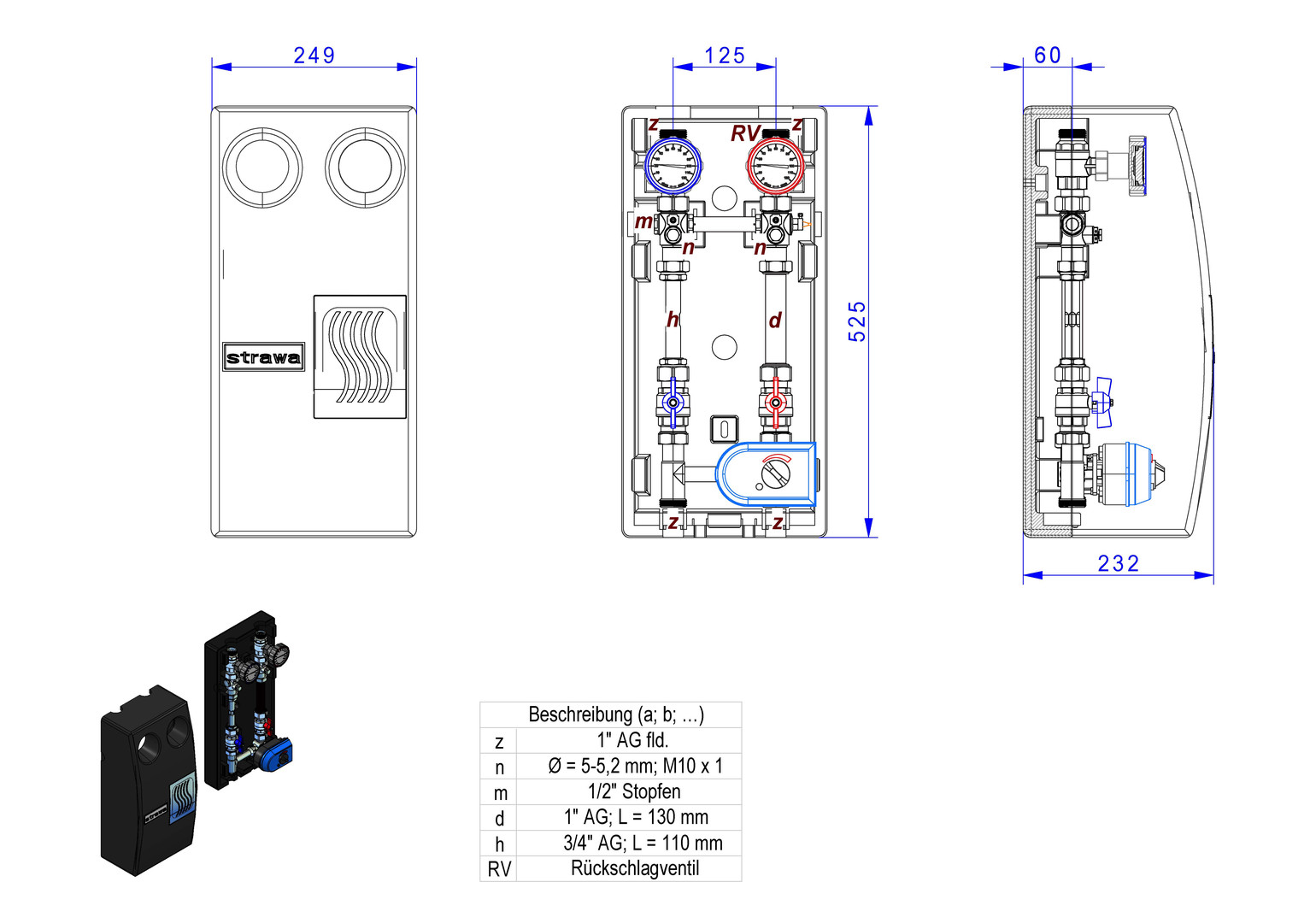 für geregelte Heizkreise (z.B. für Flächenheizung), für witterungsgeführte Vorlauftemperaturregelung (ohne Regler), passend auf strawi 125-25 Kesselverteiler, bestehend aus: Thermometer-Kugelhähnen DN 25 im Vor- und Rücklauf 0-120°C, zusätzlich mit Pumpenkugelhahn im Vorlauf (bei Wärmezählerverrohrung zusätzlicher Kugelhahn im Rücklauf), Rückschlagklappe im Vorlaufkugelhahn, mit oder ohne Wärmezählerverrohrung Länge 130 mm 2 x 1" AG oder Länge 110 mm 2 x 3/4" AG und Fühlereinbaustücke 5-5,2mm M10x1 im Vor- und Rücklauf montiert, Pumpendistanzstück bzw. Pumpe. 3-Wege-Mischer DN 25 Kvs=10,75, zusätzlicher regulierbarer Bypass im Mischer mit EPP-Wärmedämmung, max. Volumenstrom 0,86 cbm/h (10 kW, bei Delta T= 10 K, max. Betriebstemperatur 100°C, max. Betriebsdruck 6 bar, Stutzenabstand 125 mm, 249 x 525 x 232 mm, Primäranschluss 1"AG flachdichtend, Sekundäranschluss 1"AG flachdichtend