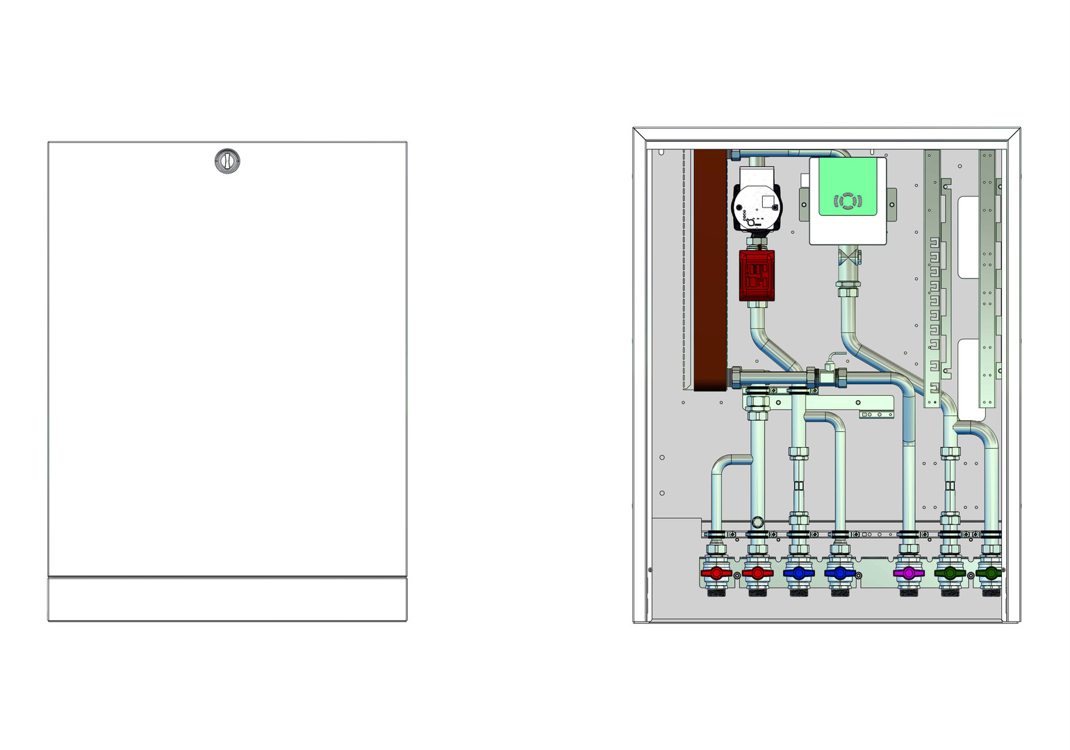 Warmwasserbereitung und Hochtemperaturabgang für statische Heizflächen, als Kompaktstation, bestehend aus: Schrank: Unterputz- oder Aufputzausführung, aus feuerverzinktem Stahlblech und alle sichtbaren Teile in weiß RAL 9016, alle Halterungen mit Schalldämmeinlage, UP-Schrank 732 x 938 x 160-220 mm, AP-Schrank 706 x 916 x 180 mm, Anschlussleiste: Kugelhähne DN 25 (1" AG flachdichtend), Zirkulationskugelhahn DN 20 (3/4" IG), Anschlussleiste 7-fach: SVL-PVL-PRL-SRL-TWW-ETWK-ATWK, Anschlussleiste 8-fach mit Zirkulation (Z): SVL-PVL-PRL-SRL-Z-TWW-ETWK-ATWK, Primär-Rücklauf optional mit Strangregulierventil Ballorex Vario, Frischwassermodul Heizungsseite: Plattenwärmeübertrager (PWÜ) kupfergelötet (CU) oder edelstahlgelötet (VA), Pulsweitenmodulierende Hocheffizienzpumpe Wilo (W) Typ Para 15-130/8-75/IPWM-12, Zonenventil DN 25 zur Absperrung der Frischwasserstation, Wärmezählerpassstück variabel 1" AG flachdichtend (Länge 130 mm) oder 3/4" flachdichtend (Länge 110 mm), Fühlereinbaustück direktfühlend, Ø 5-5,2 mm M10x1 IG (für Fabrikate Ista Sensonic, Allmess V-Lite, Pollux Com E, Techem Tech, Minol M, Rossweiner, ABB, Entec, Molline), zusätzlich der Hochtemperaturabgang im Vor-/Rücklauf für den Anschluss von statischen Heizflächen, Verrohrungsmaterial Edelstahl 1.4301 (DIN EN 10088), Filterkugelhahn im Primär-Vorlauf, Frischwassermodul Trinkwasserseite: Plattenwärmeübertragerleistung bis 102 kW (modellabhängig), Rückschlagklappe, Impulsgeber, Wasserzählerpassstück variabel 1" AG flachdichtend (Länge 130 mm) oder 3/4" AG flachdichtend (Länge 110 mm), optional mit Zirkulation mit Zirkulationspumpe ecocirc PRO 13-1/940-01 mit Sicherheitsventil und Abblaseleitung, Verrohrungsmaterial Edelstahl 1.4401 (DIN EN 10088), Frischwasserregler: mit Friwara Standardregler 1.0, Trinkwarmwassertemperatur einstellbar von 45-60° C, Zirkulationsfunktionen (Zeitintervall), Komfortschaltung für Warmhaltung des Plattenwärmeübertragers