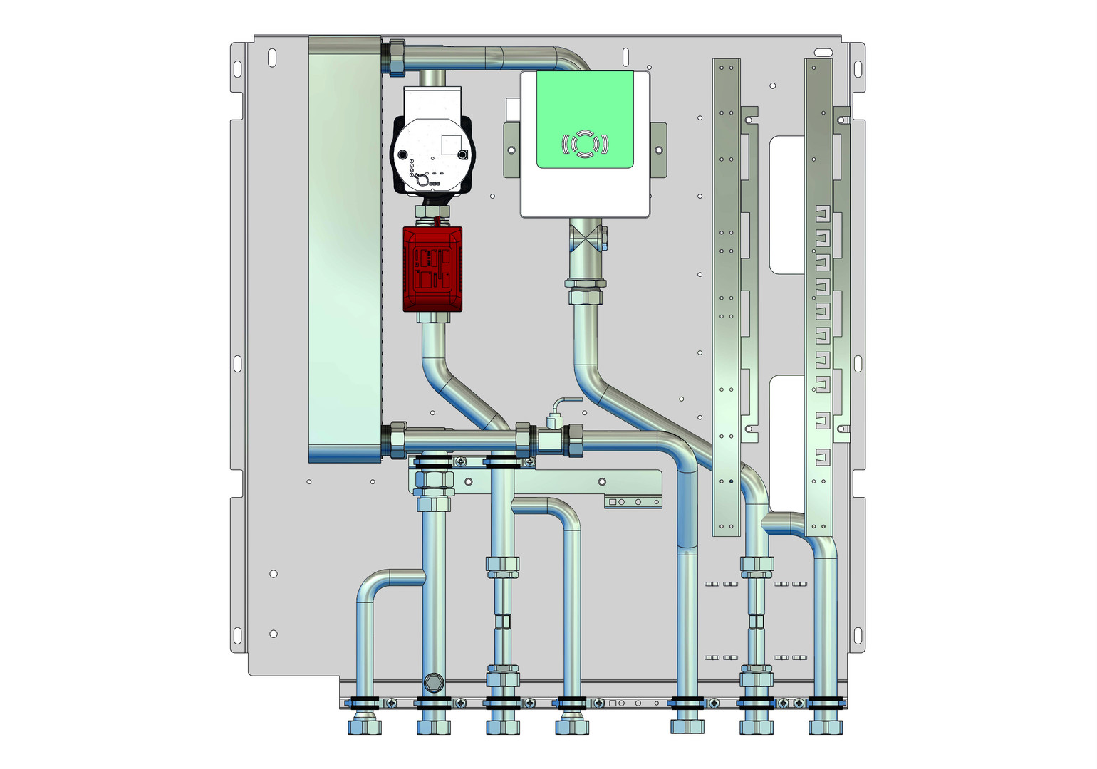 Heizungsseite bestehend aus: Plattenwärmeübertrager (PWÜ) kupfergelötet (Cu) oder edelstahlgelötet (VA), Pulsweitenmodulierende Hocheffizienzpumpe Wilo (W) Typ Para 15-130/8-75/ IPWM-12, Zonenventil DN 20 zur Absperrung der Frischwasserstation, Wärmezählerpassstück variabel 1" AG flachdichtend (Länge 130 mm) oder 3/4" AG flachdichtend (Länge 110 mm), Fühlereinbaustück direktfühlend Ø 5-5,2 mm M10x1 IG (für Fabrikate Ista Sensonic, Allmess V-Lite, Pollux Com E, Techem ? Tech, Minol M, Rossweiner, ABB, Entec, Molline), zusätzlicher Hochtemperaturabgang im Vor-und Rücklauf für den Anschluss von statischen Heizflächen, z.B. Heizkörper, Verrohrungsmaterial Edelstahl 1.4301 (DIN EN 10088), Trinkwasserseite bestehend aus: Plattenwärmeübertragerleistung bis 102 kW (modellabhängig), Rückschlagklappe, Impulsgeber, Wasserzählerpassstück variabel 1" AG flachdichtend (Länge 130 mm) oder 3/4" AG flachdichtend (Länge 110 mm), optional mit Zirkulation mit Zirkulationspumpe ecocirc PRO 13-1/940-01 inkl. Sicherheitsventil und Abblaseleitung, Verrohrungsmaterial Edelstahl 1.4401 (DIN EN 10088), Frischwasserregler bestehend aus: mit Friwara Standardregler 1.0, Trinkwarmwassertemperatur einstellbar von 45-60° Grad, Zirkulationsfunktionen (Zeitintervall), Komfortschaltung für Warmhaltung
