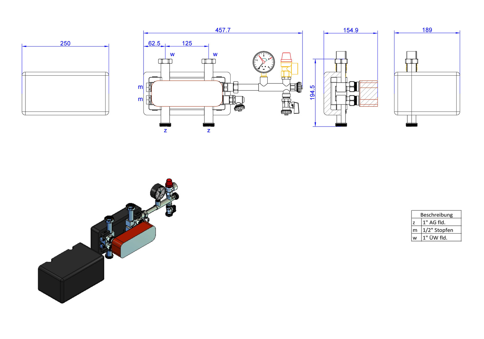 für hydraulische und/oder medium getrennte Heizkreise (z.B für Frostschutzanwendungen, Schutz der Anlage gegen Sauerstoffeintrag), kupfergelöteter Plattenwärmeübertrager, Verrohrung aus Edelstahl 1.4301, Sicherheitsgruppe (mit Manometer 0-4 bar, Sicherheitsventil DN 15 2,5 bar, SFE-Ventil und Anschluss 3/4" AG mit Kappe verschlossen für bauseitiges MAG) und EPP-Dämmung gemäß GEG mit Ausschnitten für Verteileranschlüsse, max. Betriebsdruck 6 bar, max. Betriebstemperatur 100°C, Leistung 5/10/15/20, bzw. 30 kW Leistungsangaben bei Primär: (VL/RL) 70/50°C, Sekundär (RL/VL) 37/45°C, Stutzenabstand 125 mm, Einbaulänge 172 mm, Wärmedämmung 250 x 125 x 195 mm, Sekundärseite 2 x 1“ Überwurfmutter flachdichtend, passend für strawi 125-25 Aufbaugruppe