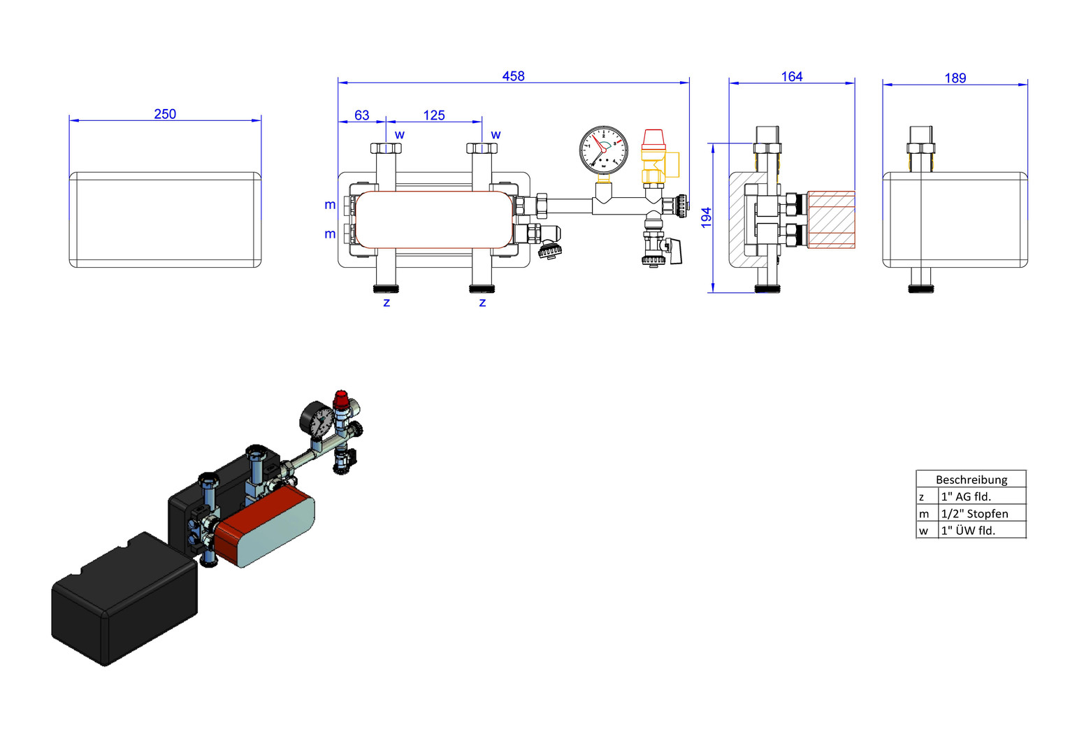für hydraulische und/oder medium getrennte Heizkreise (z.B für Frostschutzanwendungen, Schutz der Anlage gegen Sauerstoffeintrag), kupfergelöteter Plattenwärmeübertrager, Verrohrung aus Edelstahl 1.4301, Sicherheitsgruppe (mit Manometer 0-4 bar, Sicherheitsventil DN 15 2,5 bar, SFE-Ventil und Anschluss 3/4" AG mit Kappe verschlossen für bauseitiges MAG) und EPP-Dämmung gemäß GEG mit Ausschnitten für Verteileranschlüsse, max. Betriebsdruck 6 bar, max. Betriebstemperatur 100°C, Leistung 5/10/15/20, bzw. 30 kW Leistungsangaben bei Primär: (VL/RL) 70/50°C, Sekundär (RL/VL) 37/45°C, Stutzenabstand 125 mm, Einbaulänge 172 mm, Wärmedämmung 250 x 125 x 195 mm, Sekundärseite 2 x 1“ Überwurfmutter flachdichtend, passend für strawi 125-25 Aufbaugruppe