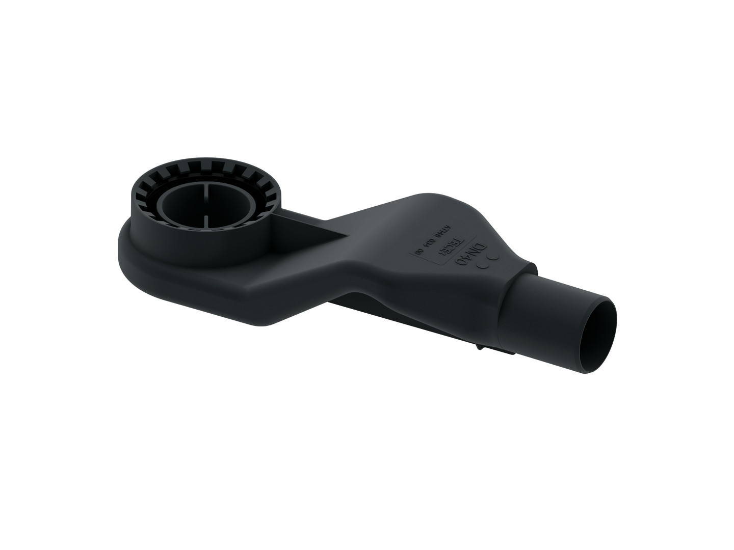 superflacher Ablauf für TECEdrainline-Duschrinne zur schwenkbaren Montage am Rinnenkörper, zum seitlichen Anschluss an DN 40 Abwasserleitung, mit demontierbarem Siphontauchrohr, Aufbauhöhe Unterkante Ablauf bis Oberkante Duschrinne= 67 mm, reduzierte Sperrwasserhöhe= 30mm (ohne Tauchrohr 20 mm). Ablaufleistung nach DIN EN 1253, bei 10 mm/20 mm Aufstau über Rost: Desiginrost basic: 0,5 l/s, 0,6 l/s-Ablaufleistung mit Fliesenmulde plate/plate II: 0,5 l/s, 0,6 l/s