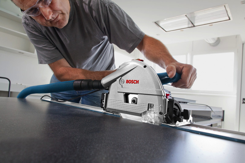 Tauchsäge GKT 55 GCE, Die kabelgebundene Tauchsäge GKT 55 GCE Professional liefert extrem präzise, saubere Schnitte in einer Vielzahl von Materialien. Dank hochwertiger Maschinenkomponenten, Präzisionssägeblatt und passendem Führungsschienensystem sind extrem präzise Ergebnisse sichergestellt. Das effiziente Staubabsaugsystem der Säge und das schallreduzierte Sägeblatt sorgen besonders in Innenräumen für komfortables Arbeiten. Darüber hinaus ermöglicht die regelbare Drehzahleinstellung Schnitte in einer Vielzahl von Materialien. Dieses Werkzeug eignet sich für Format- und Tauchschnitte in Holz, Holzverbundwerkstoffen, Platten und Plattenwerkstoffen sowie in Aluminium und Acrylglas. Es ist kompatibel mit dem Bosch Click & Clean-Staubabsaugsystem sowie den Führungsschienensystemen Festool, Mafell und Makita von Bosch. Die GKT 55 GCE Professional zeichnet sich ferner durch Merkmale wie konstante Drehzahl, integrierten Staubauslass, Drehzahlvorwahl, Spindelarretierung, Überlastschutz und Sanftanlauf aus. L-BOXX 374 (1 600 A01 2G3). 1/1 L-BOXX-Einlage für Gerät (1 600 A00 2UK). 1 x Kreissägeblatt, Top Precision Best for Wood, 165 x 1,8/1,3 x 20 mm, 48 (2 608 642 384). Innensechskantschlüssel