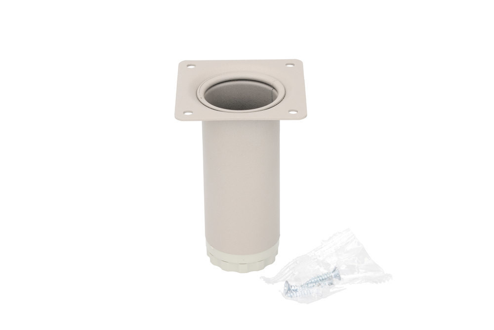 FORMAT Möbelfuß Hyro; Ausführung: Rundrohr,höhenverstellbar; Werkstoff: Stahl; Einsatzbereich: Unterbau; Farbton: aluminiumfarbig; Länge: 100 mm; Durchmesser: 40 mm; Höhenverstellung: 10 mm; Belastbarkeit je Stück: 50 kg; Breite Befestigungsplatte: 65 mm; Tiefe Befestigungsplatte: 65 mm; Basis: Möbelfuß; Befestigungsart: zum Anschrauben; Material Fußplatte: Kunststoff