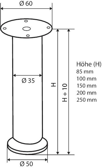 FORMAT Möbelfuß Joti; Ausführung: höhenverstellbar,Rundrohr; Werkstoff: Stahl; Einsatzbereich: Unterbau; Farbton: aluminiumfarbig; Länge: 200 mm; Durchmesser: 35 mm; Höhenverstellung: 10 mm; Basis: Möbelfuß; Befestigungsart: zum Anschrauben; Durchmesser Befestigungsplatte: 60 mm; Werkstoff Befestigungsplatte: Stahl; Ø Fußplatte: 50 mm