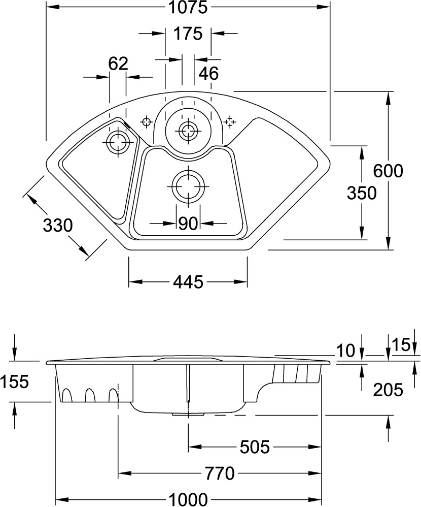 für den aufliegenden Einbau, Montage auf einem Eckspülenunterschrank mit Schenkelmaß 90 cm, 2 Becken verschließbar