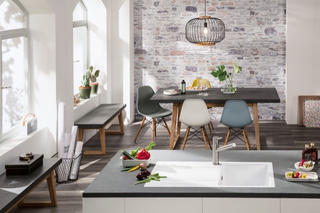 für den flächenbündigen Einbau in Natur-/Keramik-/Glas- und Quarzsteinarbeitsplatten, minimale Unterschrankbreite 50 cm, Minimalstärke der Platte bei Platzierung mit Geschirrspüler mind. 3 cm, Dampfgarschale GN 1/3 einsetzbar mit Drahtkorb, Material TitanCeram