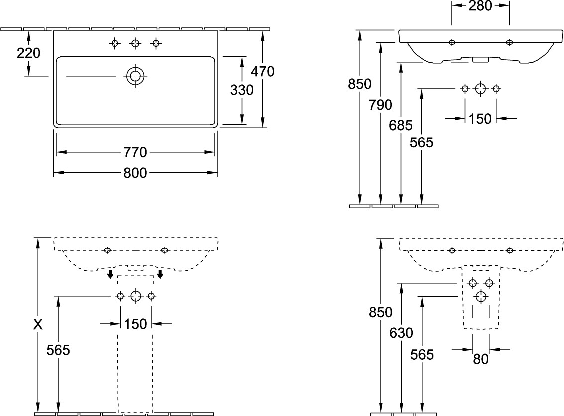 V&B Möbel-Waschtisch Avento 80 x 47 cm, Hahnloch, mit Überlauf, weiß