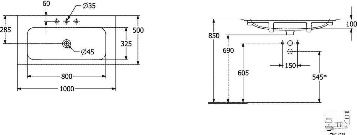 V&B Möbelwaschtisch Finion 100x50cm, mit 1 Hahnloch/ verdeckter Überlauf, weiß C+