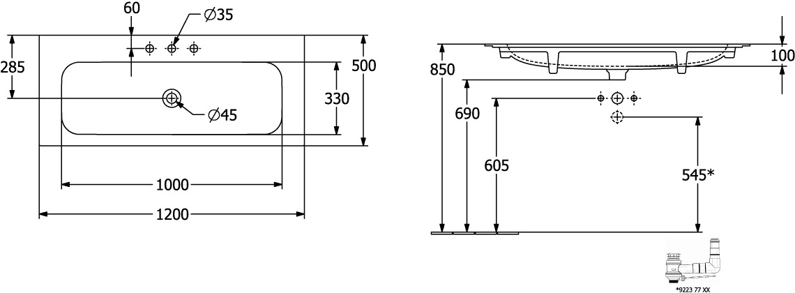 V&B Möbelwaschtisch Finion 120x50cm, mit 1 Hahnloch/ verdeckter Überlauf, pure black C+