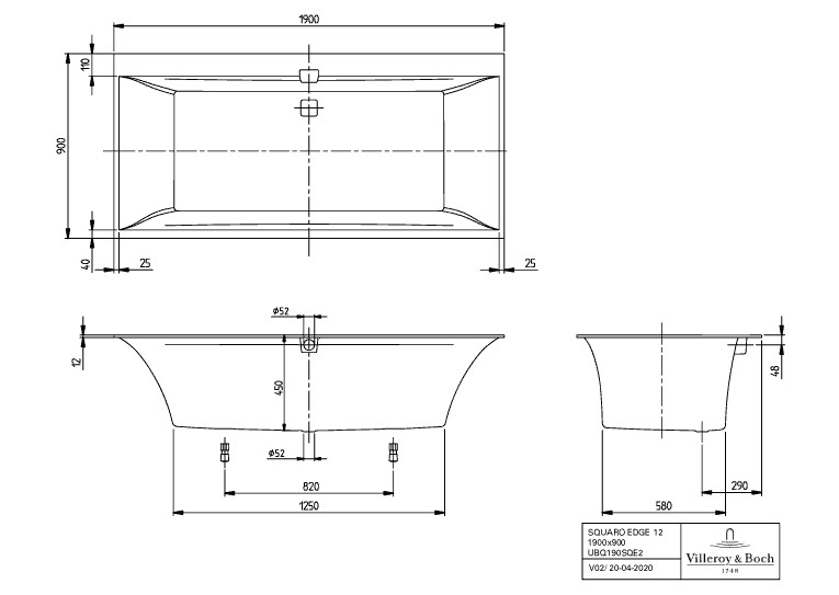 V&B Rechteck-Badewanne Squaro Edge 12 Duo 190 x 90 cm, weiß, Ablauf mittig, Quaryl