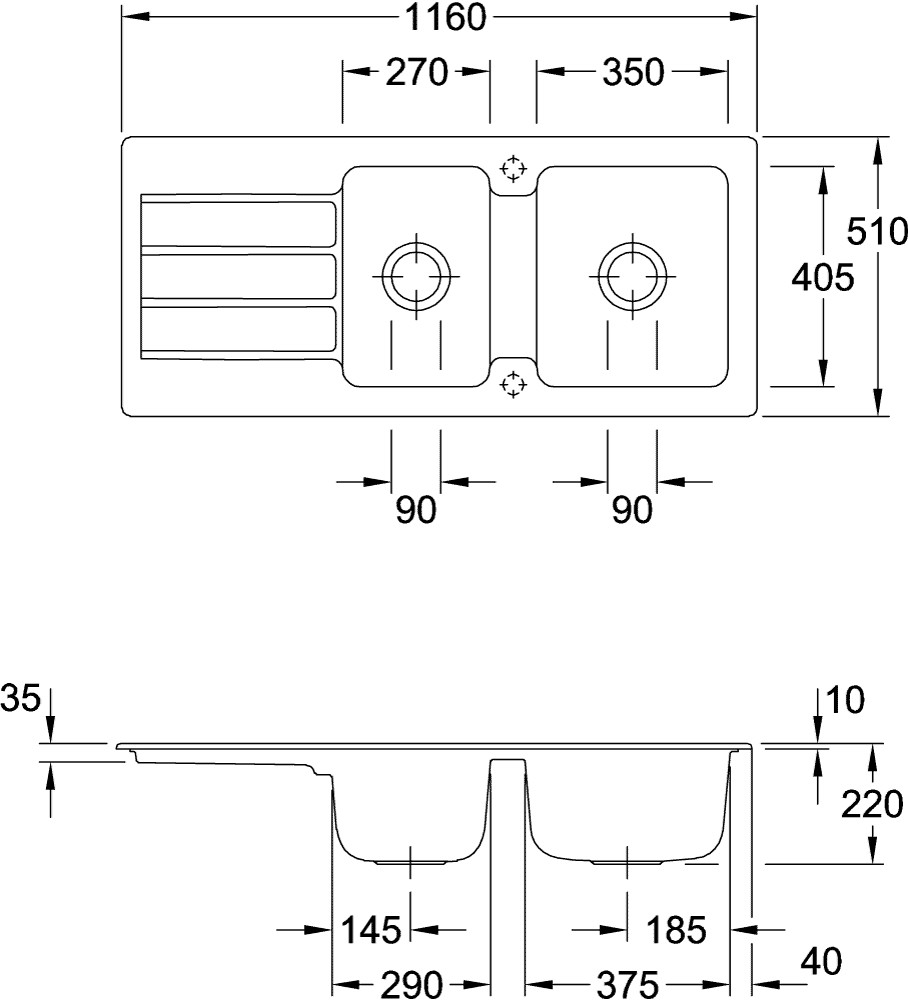 reversibel, für den aufliegenden Einbau, minimale Unterschrankbreite 80 cm, 2 Becken verschließbar