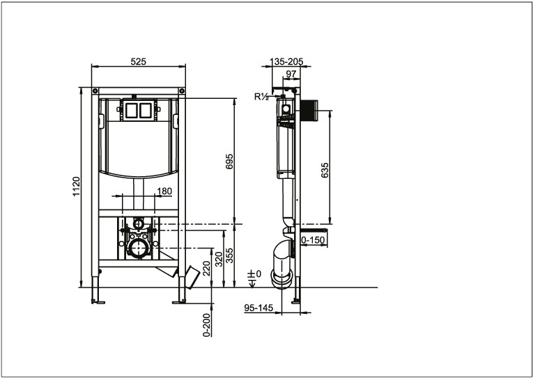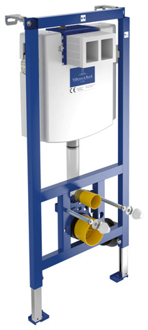 selbsttragende, pulverbeschichtete Stahlrahmenkonstruktion, komplett vormontiert, Betätigung von vorne, mit kleiner Revisionsöffnung, geprüft nach DIN EN 14055, für Wand-WC, zur Trockenverkleidung, Einbau vor Massivwand, in Leichtbau-Ständerwand u.v.m, Verbindung zur Betätigungsplatte über Kabeltechnik mit Dreh-Klick-Verbindung, Verstellbereich Füße von Rohfußboden bis OKFFB 0-20 cm, Tiefenverstellung Vorderkante Element 13,5-20,5 cm, 4 Wandbefestigungspunkte, schwitzwasserisolierter UP-Spülkasten mit 2-Mengenspülung (7,5-4,5 l/4-2 l), Werkseinstellung 6/3 l, Füllventil Armaturengruppe I, 2-teiliges Eckventil-Anschlussset R1/2, Ablaufbogenschelle mit 4 Verstellpositionen, PE-WC Anschlussbogen DN 90 (Ø 90) mit Übergangsmuffe DN 90 (Ø 90)/DN 100 (Ø 110) mit Bauschutz, WC-Anschlussgarnitur DN 90 (Ø 90)/18 cm komplett, Bauschutzkasten für Revisionsöffnung kürzbar, flexibler Schlauch zum Füllventil von Hand verschraubbar, verstellbare Spülstromdrossel zur Anpassung an spülrandlose WC-Becken, Prüfzeichen für UP-Spülkasten: Armaturengruppe I, mit 2 Wandhalter, mit selbsthemmende Füße mit verstellbaren Fußplatten und Befestigungsmaterial, 2 WC-Haltebolzen M12 einstellbar 18/23 cm mit Bauschutz und Muttern, Montageanleitung, ohne Betätigungsplatte