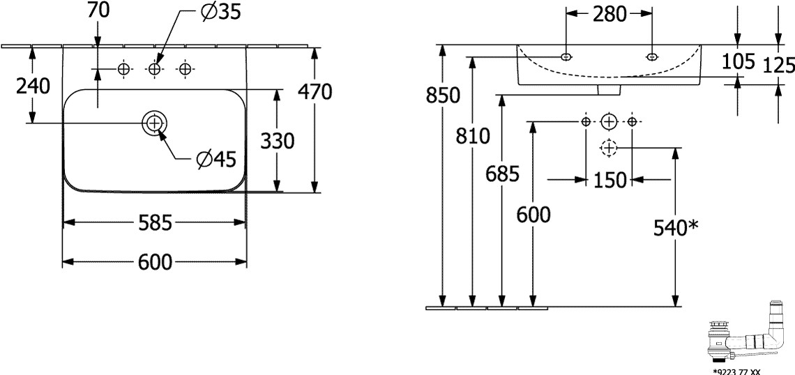 V&B Waschtisch Finion 60x47cm, mittleres Hahnloch durchstochen, verdeckter Überlauf, pure black C+