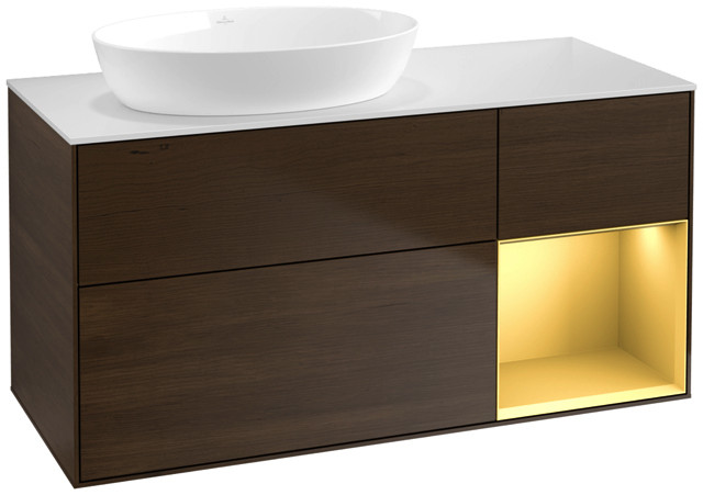 V&B Waschtisch-Unterschrank Finion 120cm, Abdeckplatte white matt, Regal Gold matt lacquer, Walnut veneer