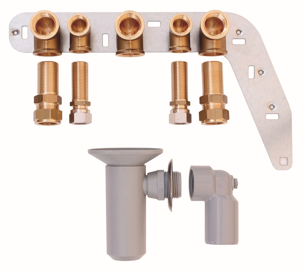 Montageblech mit Anschlusswinkeln Heizkreis 2 x Rp 3/4, Gas Rp 3/4, mit 2 Übergängen 1/2 auf 15 mm für Kalt-/Warmwasser 2 Stück 3/4 auf 22 mm für Vor-Rücklauf, Ablauftrichter komplett mit Anshlusswinkel und Rosette, Konsole fur UP-Montage, Schrauben und Dubel verwendbar fur atmoTEC exclusive, atmoTEC plus, ecoTEC exclusive VC 156-326, ecoTEC exclusive VCW, ecoTEC plus VC 146-306, ecoTEC plus VCI, ecoTEC plus VCW