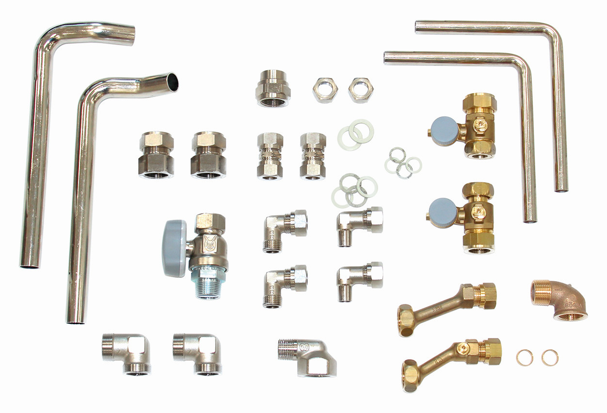 heizungsseitige Verrohrung mit Wartungshähnen, G 3/4 x 22 mm mit Winkel- und Quetschverschraubung, kalt- und warmwasserseitige Verrohrung 15 x 1,0 mm, Kaltwasserabsperrung G 1/2, Gashahn R 3/4 nach TRGI, 2 x 15 mm mit R 1/2 Winkel- und Adapter, Austausch auf Fremdinstallation Viessmann Vitodens 200