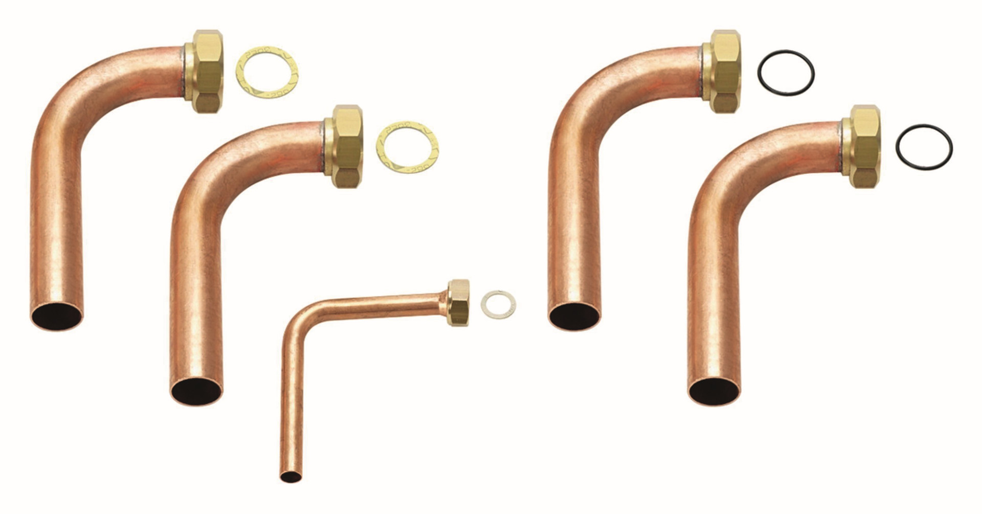 4x Rohr 90° für Heizung und Sole Ø 35 mm mit Überwurfmutter G 1 1/2, 2x Rechteckdichtung 1 1/2", 2x O-Ringdichtung (für Soleleitung), 1x Rohr 90° für ADG Ø 15 mm mit Überwurfmutter G 3/4 und Dichtung, verwendbar für flexoCOMPACT exclusive