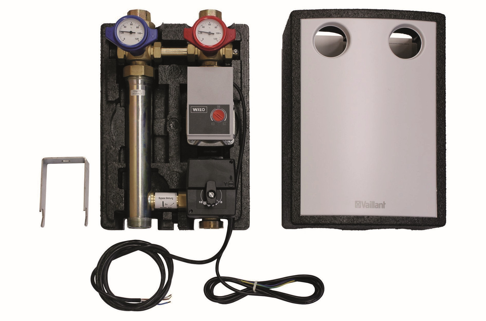 Hocheffizienz-Pumpe (max. Förderhöhe 6,2 m, max. Volumenstrom 3,3 cbm/h), 2 Kugel-Absperrhähnen mit integrierten Thermometern, davon 1 Kugelhahn mit Schwerkraftbremse, 3-Wege-Mischer mit Stellantrieb 230 V, mit Wärmedämmung (EnEV) verwendbar für aroTHERM mit atmoTEC exclusive, atmoTEC plus, auroCOMPACT, ecoCOMPACT, ecoCRAFT exclusiv, ecoTEC exclusive, ecoTEC plus, ecoVIT, ecoVIT exclusiv, icoVIT exclusiv, renerVIT