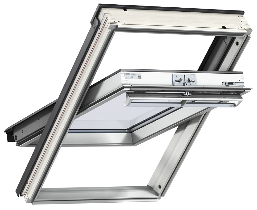 Flügel und Blendrahmen bestehend aus einem Holzkern, der nahtlos mit Kunststoff (Polyurethan umgossen ist.