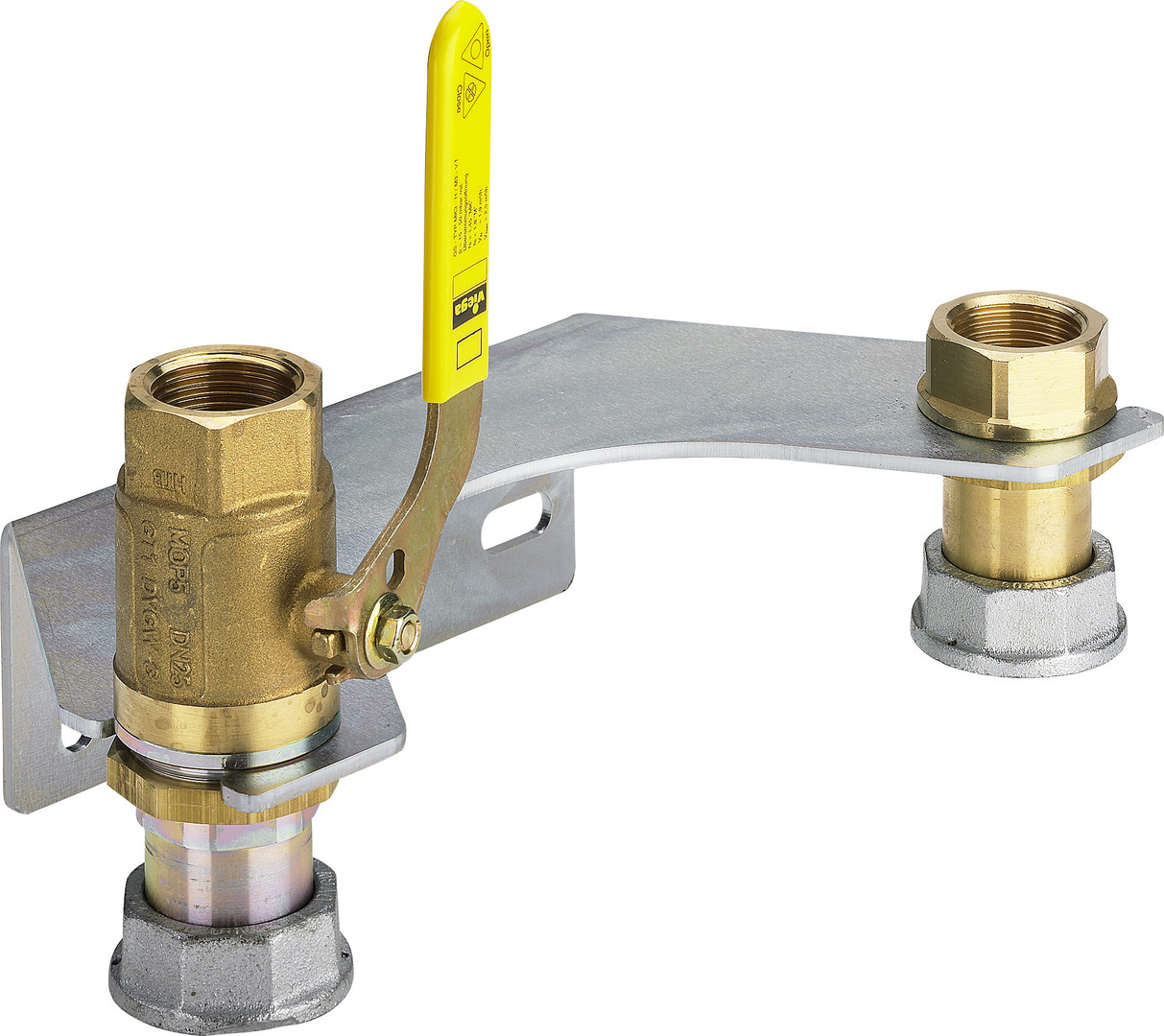 für Zweistutzengaszähler, Eingang Kugelhahn Messing mit Rp-Gewinde, Ausgang Rp-Gewinde, abschließbar, plombierbar, mit beidseitig montierter Zählerverschraubung, Wandhalterung, Umgebungstemperatur max. 70 °C, Betriebsdruck max. 0,5 MPa (MOP 5), höher thermisch belastbar, 650 °C/30 min GT1, mit DIN-DVGW-G-Prüfzeichen