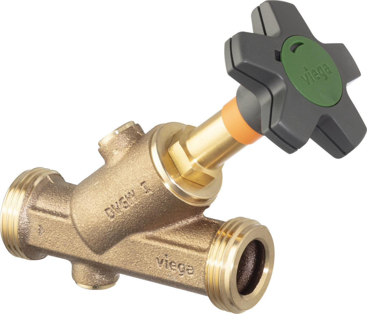 (Freistromventil) mit zylindrischem AG nach ISO 228 für flachdichtende Verschraubungen, Ventilgehäuse und -Oberteil aus Rotguss oder Siliziumbronze nach DIN 50930-6/DIN EN 1982, Ventilsitz und Ventiltellereinheit aus Edelstahl, mit Spindelübersetzung, Stellungsanzeige offen/geschlossen, Handrad ergonomisch und geschlossen mit Medienkennzeichnung grün/rot auswechselbar, mit Entleerungsstopfen G 1/4, Betriebsdruck 1,6 MPa (PN 16), Betriebstemperatur max. 90 °C, mit DVGW-Prüfzeichen