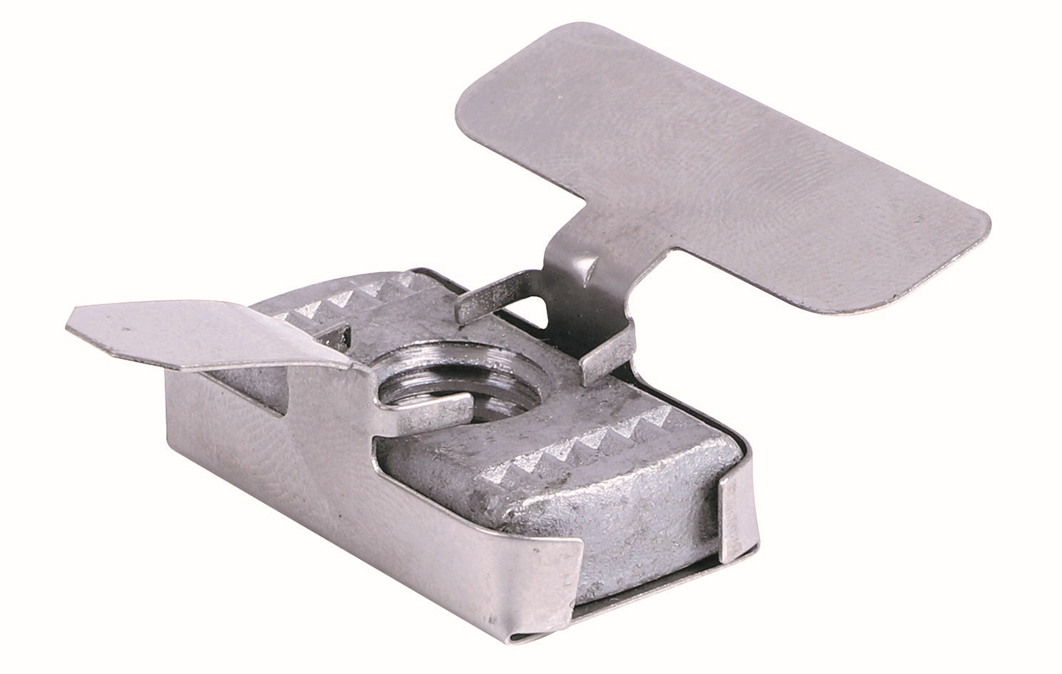 patentierte Schiebemutter zur Anbindung von Schellen, Schiebestücken oder RapidStrut Schienen an Maxx Schwerlastprofilen, empfohlene Anbindung mit Gewindestangen M12, U-Scheiben 40mm und Sechskantschrauben M12, zur Anbindung von Schellen mit M16- oder 1/2"-Anschlussgewinde ist ein Gewindeadapter erforderlich, Schiebemutter aus Stahl, Klemmeinsatz aus Edelstahl, Schiebemutter feuerverzinkt