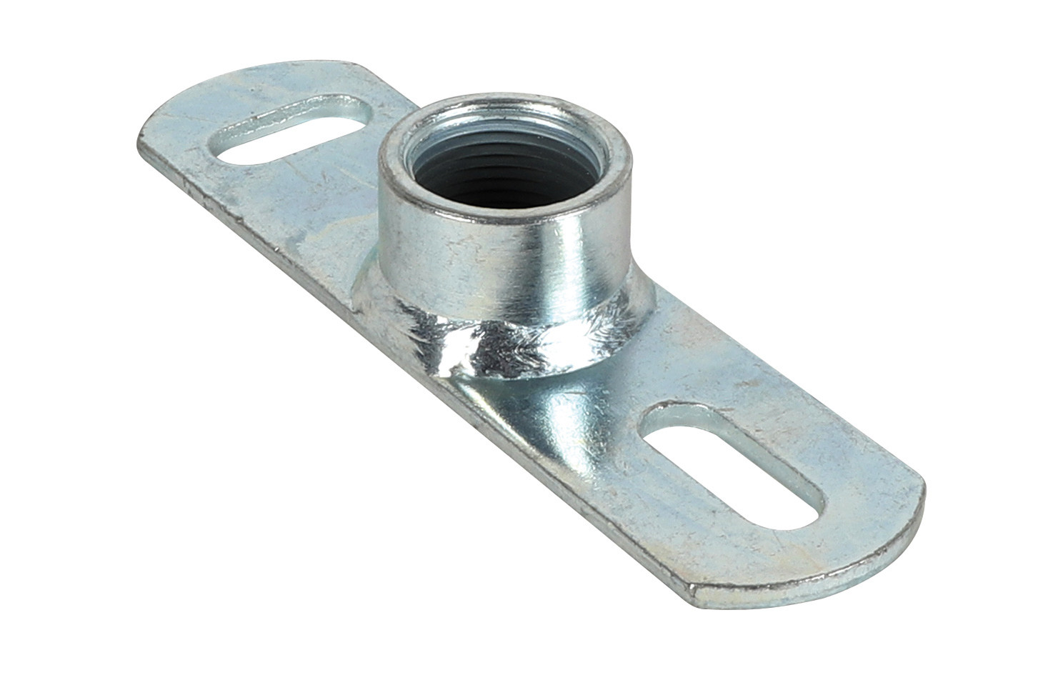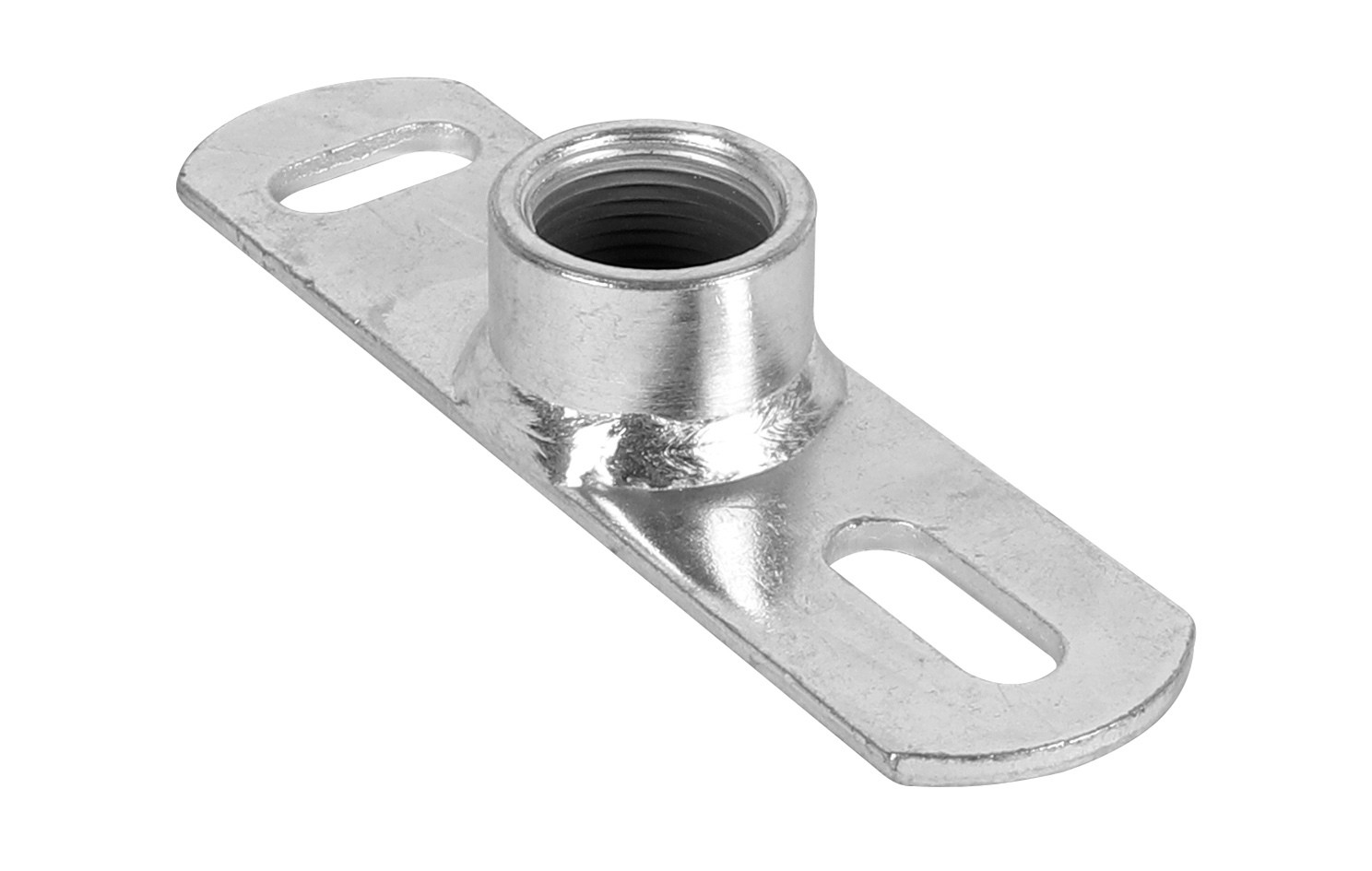 zur Befestigung an Wand oder Decke, Befestigungslöcher als Langlöcher um 90° zueinander ausgestanzt, mit CO2-geschweißter Anschlussmutter