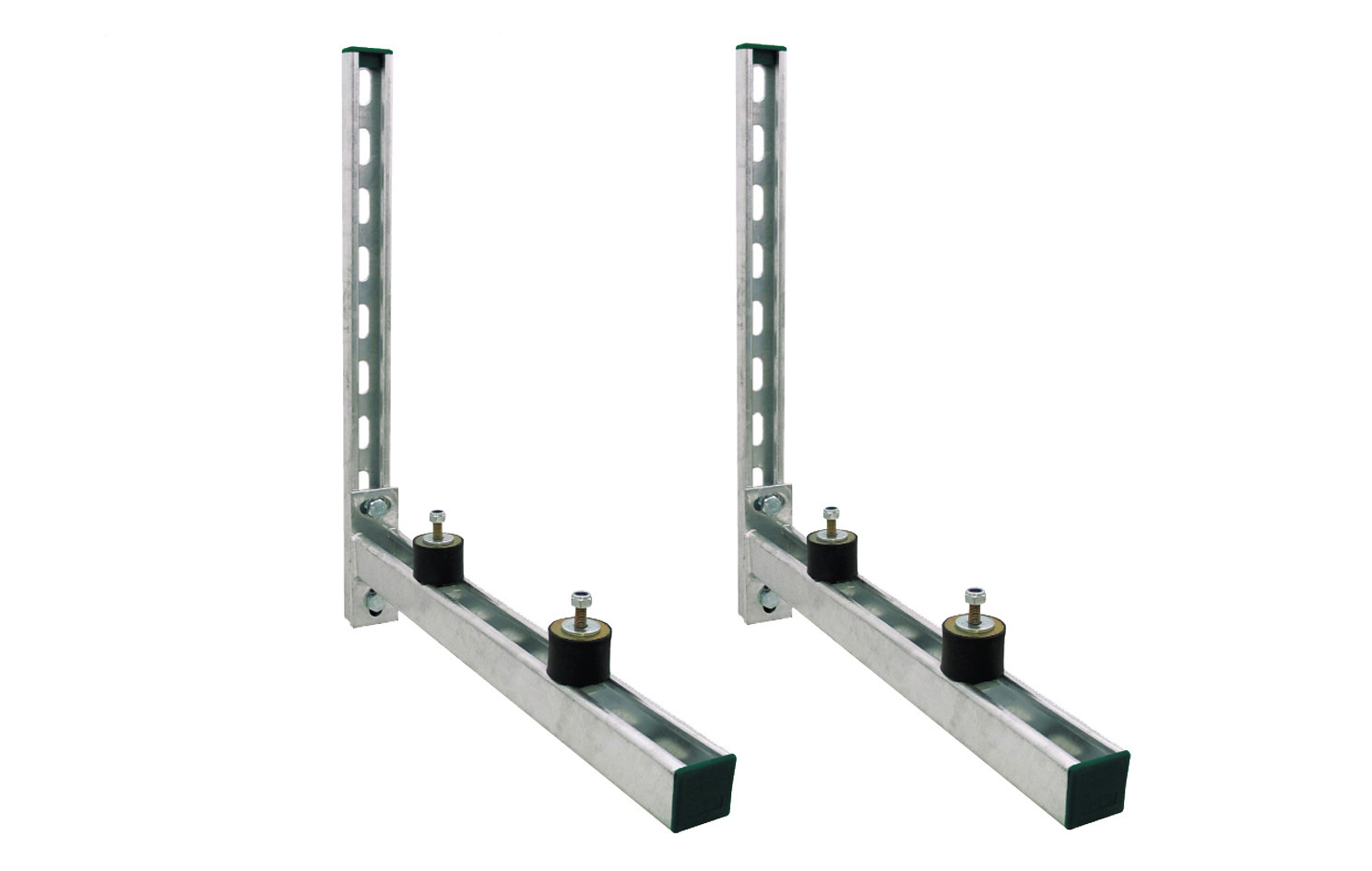 universeller Befestigungssatz zur Wandbefestigung von Klimaanlagen, Heizapparaten, Kompressoren und anderen schweren Geräten, Schallschutz mittels Schwingungsdämpfer (Stützen aus vulkanisiertem Gummi), bestehend aus 2x Wandkonsolen aus Strut 41 x 41 mm, 2x Wandschienen aus Strut 41 x 21 mm, 4x Schwingungsdämpfer, 2x Schienenendstopfen