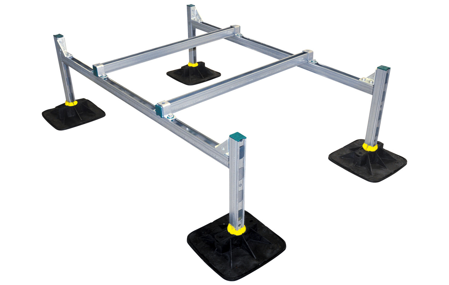 Rahmenkonstruktion zur Montage von Klimageräten und Anlagen auf Flachdächern, mit rutschfester Antivibrationsmatte zur optimierten Lastverteilung und zum Schutz vor Verletzungen der Dachmembrane, keine Kalkulation nötig, da vordefinierte max. Belastungswerte, max. Gewicht des Gerätes 150 kg, Höhe des aufgeständerten Gerätes max. 1,20 m über Flachdachhöhe, Komponenten weitgehend vormontiert geliefert, Spritzgussteile aus WPC (Holz-Kunststoff-Verbundwerkstoff) bzw. PA mit 30% Glasfaseranteil, Oberflächenbeschichtung Ultra Protect 1000, Systemtechnologie, ein System für Installationen im Innen- und Außenbereich, besteht min. 1000 Std. Salzsprühtest nach DIN ISO 9227