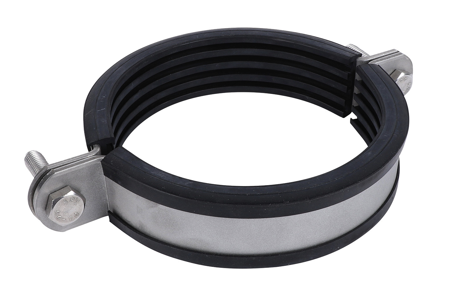 zweiteilige Schelle mit zwei Verschlussschrauben, schwere Ausführung, mit CO2-geschweißter Anschlussmutter, Schallschutzeinlage aus EPDM-Gummi, schwarz, separat verfügbar: Schallschutzeinlage aus Silikongummi (rot-braun), hitzebeständig bis +200 °C (A 35 15), alterungsbeständig, geeignet für Temperaturen von -30 °C bis + 110 °C