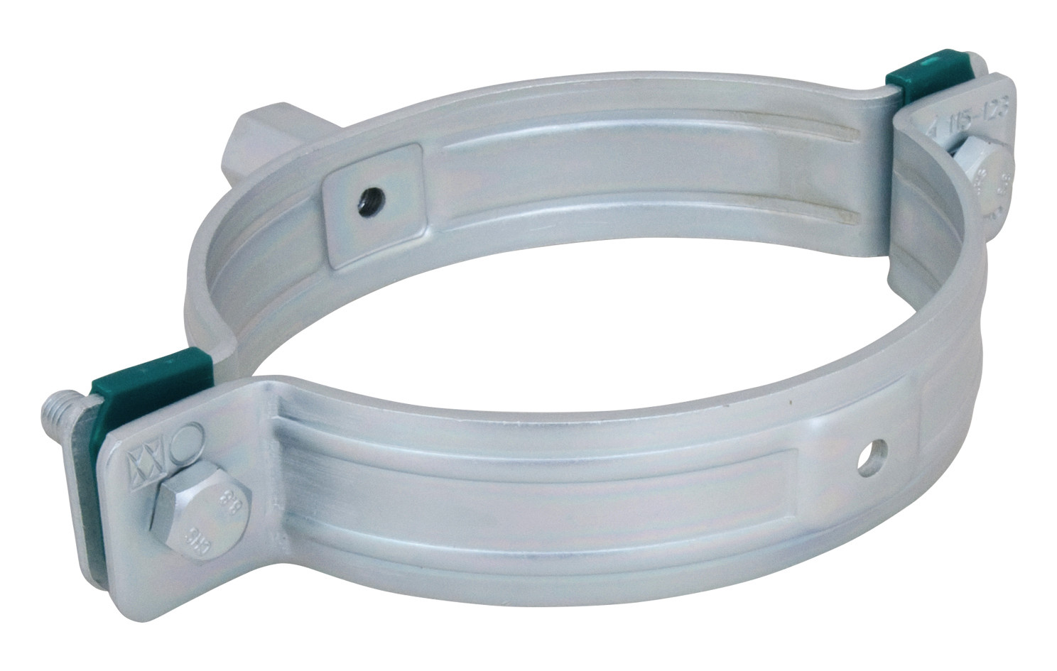 zweiteilige Schelle mit zwei Verschlussschrauben, bis 5" Verschlussmuttern fest in einer Kunststoffhalterung, schwere Ausführung, Verschlussschrauben mit Antiverlustscheibe gesichert, mit CO2-geschweißter Anschlussmutter, Material aus Stahl, Oberflächenbeschichtung mit Systemtechnologie, ein System für Installationen im Innen- und Außenbereich, besteht min. 1.000 Std. Salzsprühtest nach DIN ISO 9227