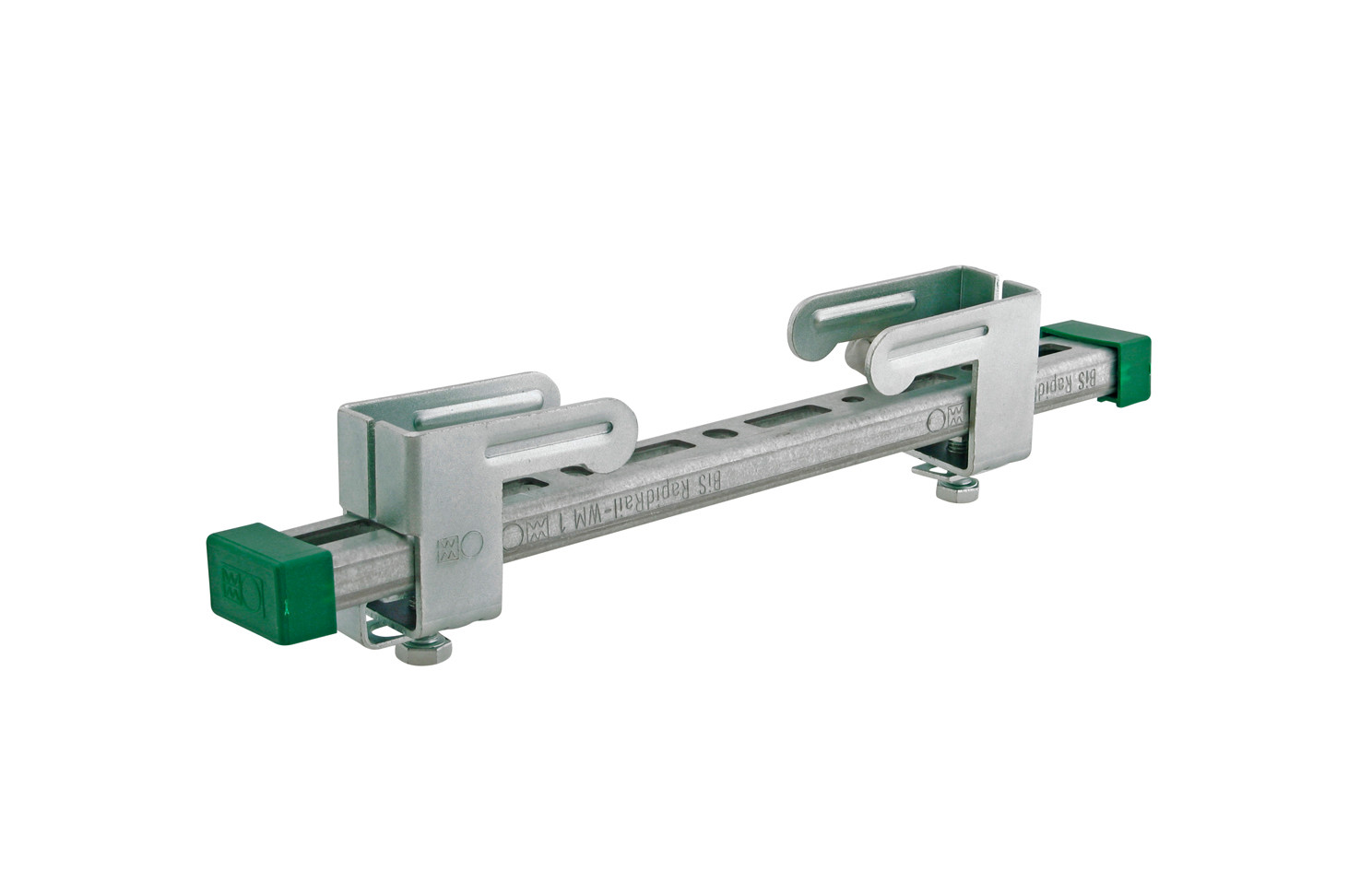 zur Befestigung von leichten Elementen wie Kabelrinnen, Lüftungskanälen, usw. an Trägern ohne Schweißen oder Bohren, bis Flanschstärke 20 mm, Trägerklammer aus Stahl, Schiene aus Stahl 1.0242, Trägerklammern elektrolytisch verzinkt, Schiene sendzimirverzinkt, bestehend aus 1x Schiene WM0 (27 x 18 mm), 2x Trägerklammern WM0 (Werk-Nr. 607 0 000), 2x Schienen-Endstopfen