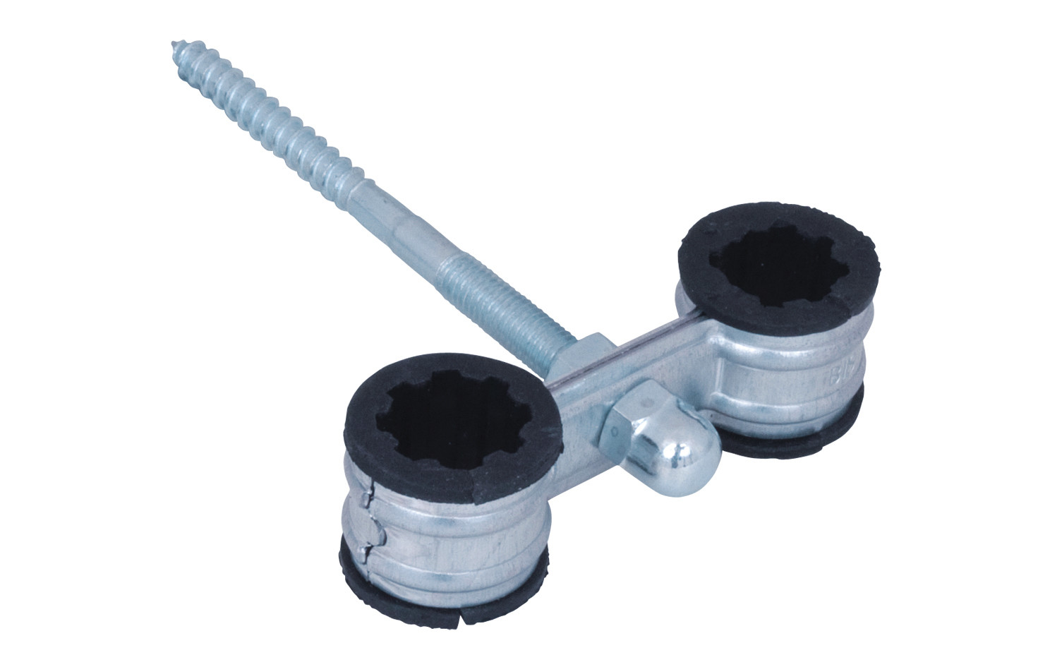 für Doppelbefestigung (2 Rohre), durch Verzahnung verdrehsicher, Ansatzschraube M8 mit Bund und Hutmutter, elektrolytisch verzinkt, Einlage alterungsbeständig, Schallschutz für DIN 4109