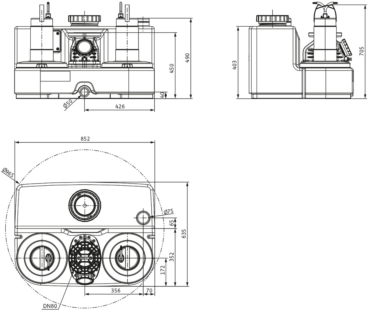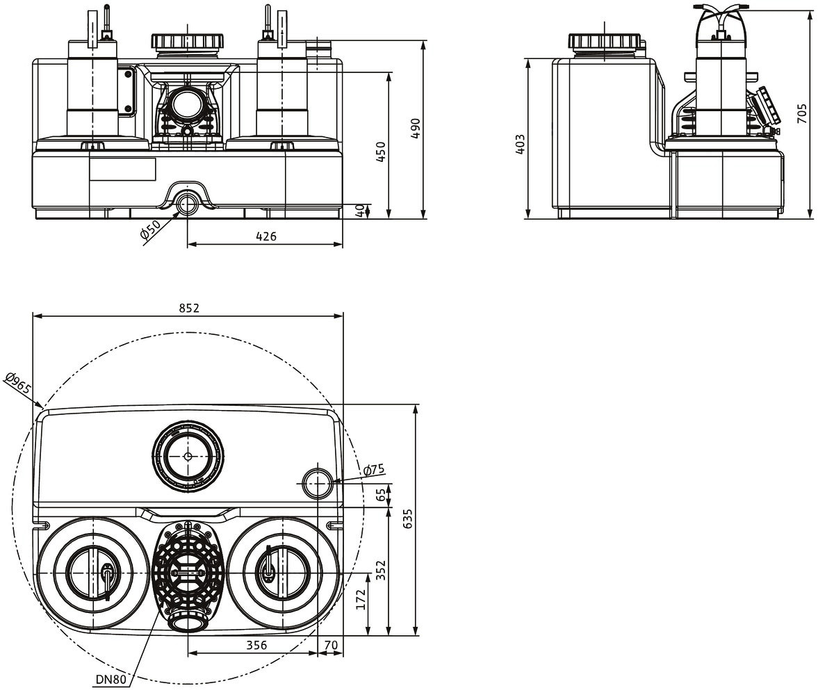 kompakt, anschlussfertig, vollüberflutbar, zur Förderung von fäkalienhaltigem Abwasser, wenn das Abwasser nicht über das natürliche Gefälle dem Kanalsystem zugeführt werden kann, zur rückstausicheren Entwässerung, wenn die Ablaufstelle unterhalb der Rückstauebene liegt, Schaltgerät mit netzunabhängigem Alarm und Sammelstörmeldung, mit Schaltgerät und Anschlusskabel mit Stecker, Flanschstutzen DN 80/100, Manschette DN 100 für Druckanschluss, Manschette 75 mm für Entlüftungsanschluss, Manschette DN 50 für Entleerungsanschluss, Zulaufset mit Lochsäge 124 mm und Dichtung DN 100, Befestigungsmaterial, Dämmschutzmatte, 9 V Akku, Betriebs- und Wartungshandbuch