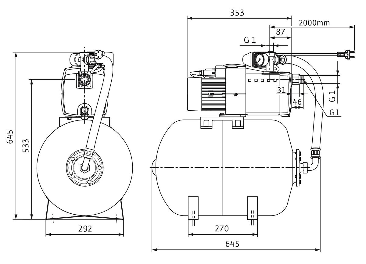 mit Membran-Druckbehälter, zur Wasserversorgung (Trinkwasserzulassung nach ACS), Beregnung, Bewässerung und Berieselung, Regenwassernutzung, mit Pumpe, Druckschalter, Manometer, Membran-Druckbehälter (Inhalt 50 l oder 100 l), Druckschlauch mit Stahlgehäuse und Schraubanschluss, 1x Kunststoffverbinder mit Dichtung für den manuellen Anschluss an das Zulaufrohr, Wilo-Connector (elektrischer Schnellverbinder), Einbau- und Betriebsanleitung, Plug & Pump-System, Geräuschpegel zwischen 56 dB(A) und 64 dB(A)