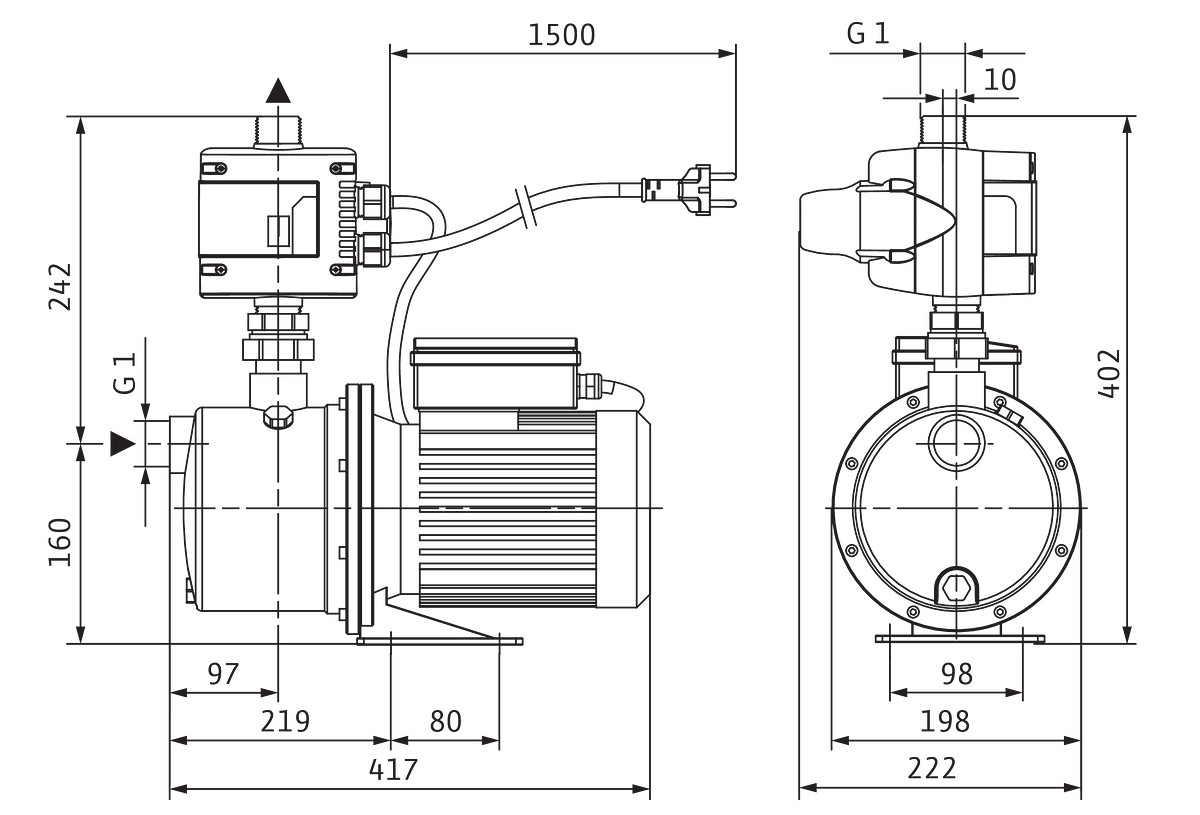 selbstansaugende Wasserversorgungsanlage, zur Wasser- und Regenwasserförderung aus Brunnen und Behältern für Beregnung, Bewässerung und Berieselung, Plug&Pump-System, 360° drehbares Display, elektronische Pumpensteuerung, Trockenlaufschutz, bestehend aus Pumpe Wilo-Jet WJ, Pumpensteuerung Wilo-HiControl 1, Einbau- und Betriebsanleitung der Pumpe Wilo-Jet WJ, Einbau- und Betriebsanleitung des Schaltgeräts Wilo-HiControl 1