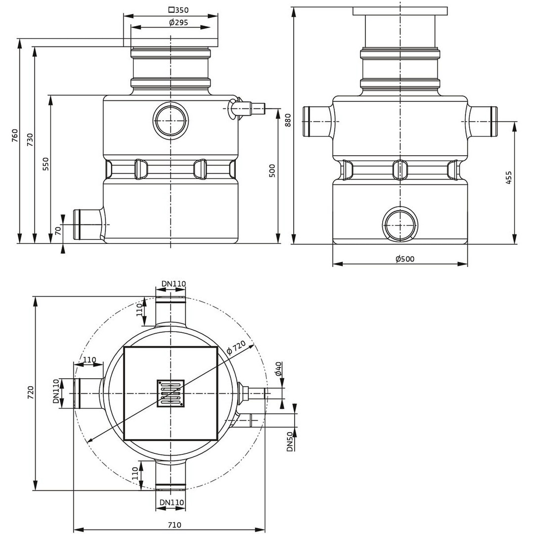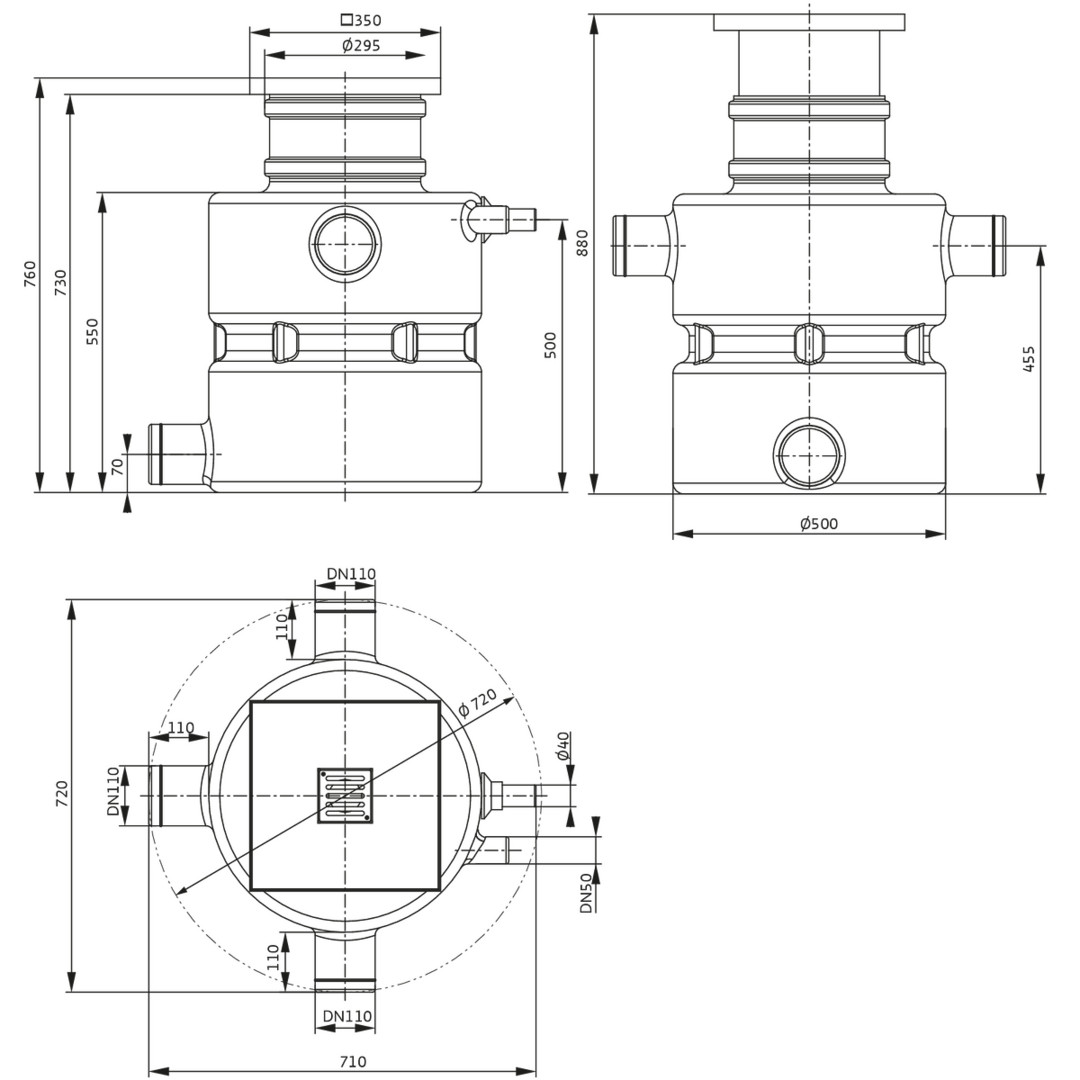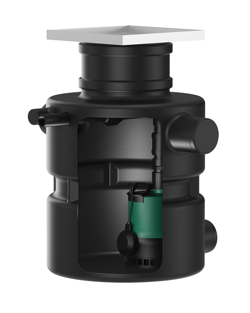 integrierte Pumpe mit Rückschlagklappe, Abdeckung mit Bodenablauf und Fliesenrahmen, zur Förderung von vorgereinigtem Abwasser ohne Fäkalien (nach DIN EN 12050-2), welches nicht über das natürliche Gefälle dem Kanalsystem zugeführt werden kann, Pumpe mit angebautem Schwimmerschalter im Kunststoffbehälter zum Unterflureinbau, mit installierter Druckleitung und Rückschlagklappe, Pumpenkabel (5 m bzw. 10 m lang) mit angebautem Schutzkontakt-Stecker