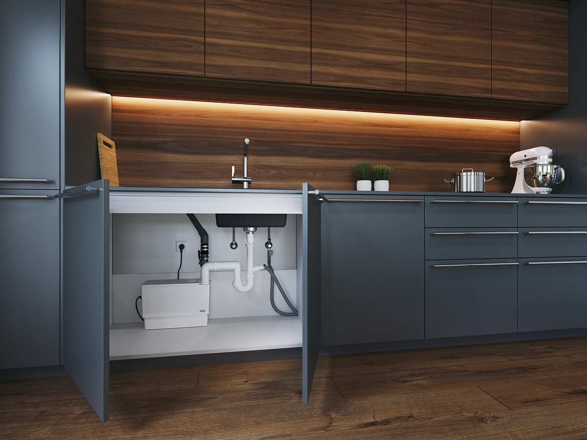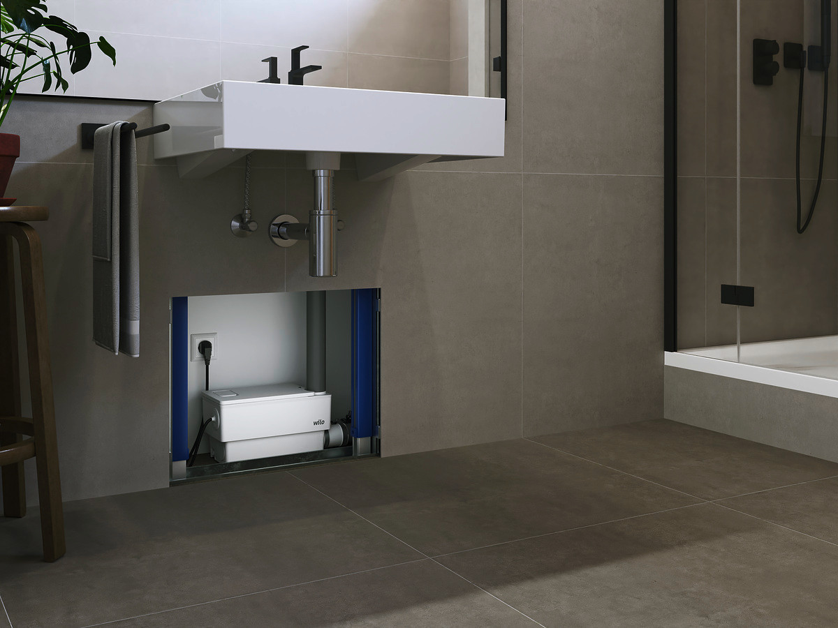 anschlussfertige Hebeanlage für die Entwässerung von Waschbecken, Dusche, Badewanne und WC, für die Installation innerhalb von Räumen oder als Vorwandinstallation, zum Anschluss der folgenden Entwässerungsgegenstände, MINI3-XXS für Waschbecken und Dusche, MINI3-XS für Waschbecken, Dusche, Badewanne, Geschirrspüler, Waschmaschine, MINI3-XS/WC für Toilette, Waschbecken, Dusche, MINI3-XXS und MINI3-XS zur Sammlung und Förderung in häuslichen Bereichen von Abwasser ohne Fäkalien, MINI3-XS/WC zur Sammlung und Förderung in häuslichen Bereichen von Abwasser mit Fäkalien