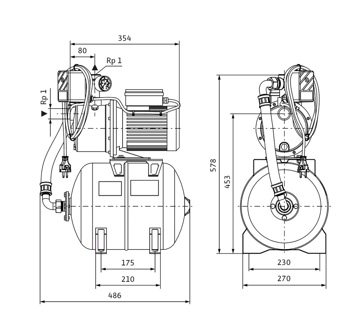 für Wasserversorgung, Beregnung, Bewässerung und Berieselung, Wasserförderung aus Brunnen und tiefer liegenden Behältern, mit Pumpe, Druckschalter, Manometer, Membrandruckbehälter (20/50 L), Druckschlauch mit Stahlmantel und Verschraubung, Einbau- und Betriebsanleitung, rostfreier Edelstahl