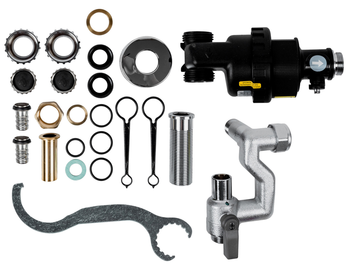 platzsparendes Set zum Schutz des Gerätes und der Hocheffizienzpumpe, bestehend aus Schlammabscheider mit Magnetitabscheider, Verrohrung Rücklauf mit Absperr- und Befüllfunktion, Anschluss für Sicherheitsventil R1/2