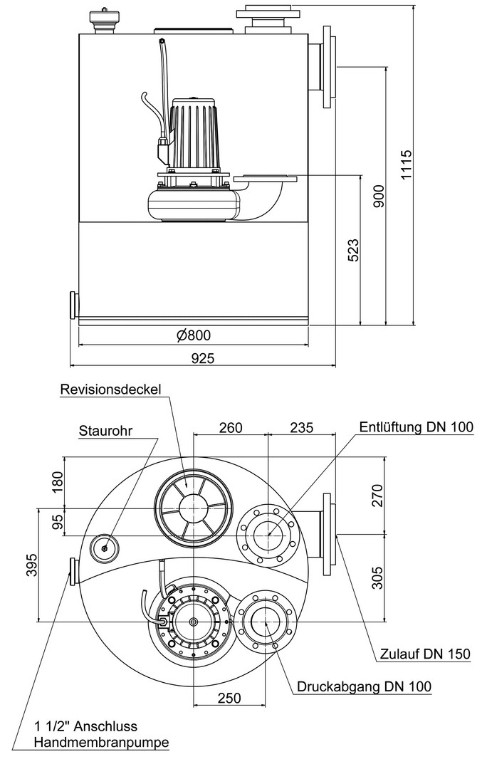 Sammelbehälter aus Polyethylen mit 350 l Gesamtinhalt, 175 l Schaltvolumen, Wirbelradpumpe mit großem freien Durchgang (80 mm), Abdichtung durch Gleitringdichtung und Wellendichtring mit zwischenliegender Ölkammer, Pumpengehäuse mit angegossenem Abgangsbogen DN 100, seitlicher Zulauf mit Losflansch DN 150, zusätzlicher Anschluss 1 1/2" für Handmembranpumpe, Entlüftung mit Losflansch DN 100 (Ø 110 mm), Betriebsart S3 - 25%, fertig montierte Anlage mit 3,5 Anschlusskabel zum Motor und 3,5 m Pneumatikschlauch zur Steuerung, mit ZPS1: pneumatische Niveausteuerung mit Mikrocontroller, LCD-Klartextanzeige für Füllstand/Wartung/Betriebsstunden und Störmeldungen sowie netzabhängige Alarmanlage im Schaltkasten zur Innenraummontage, mit Kleinkompressorset zur Lufteinperlung, Sonderabmessungen/Sonderzuläufe und vor-Ort-Montage möglich, für Entsorgung von Abwasser aus Mehrfamilienhäusern oder gewerblichen Betrieben u. ä., zur Überflurinstallation in frostgeschützten Räumen unterhalb der Rückstauebene, 400 V, 50 Hz, Schutzart IP 57, Förderhöhe max. 11 m, Fördermenge max. 60 m³/h, Korngröße 80 mm, Durchmesser Einlässe DN 150, Durchmesser Abgang DN 100, Entlüftung Außen-Ø 110 mm