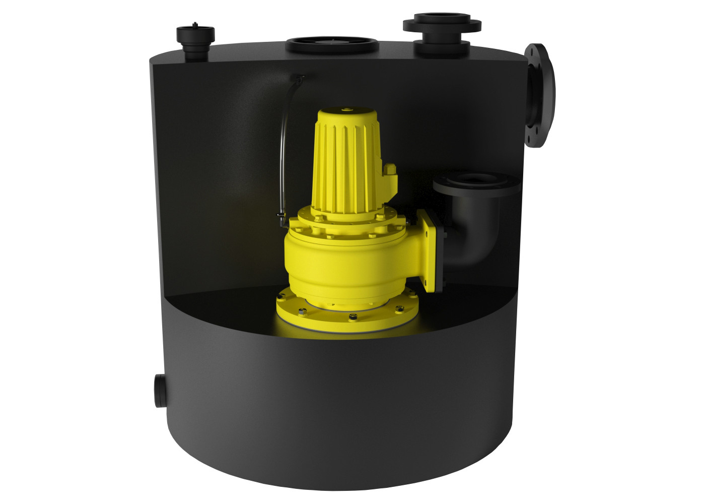 Sammelbehälter aus Polyethylen mit 480 l Gesamtinhalt und 270 l Schaltvolumen, Kanalradpumpe mit Faserschneidplatte mit großem freien Durchgang (80 mm/1000 mm), Abdichtung durch Gleitringdichtung (bis 4 kW) oder Hartgussdichtung (ab 5,5 kW) und Wellendichtring mit zwischenliegender Ölkammer, Anschluss 1 1/2" für Handmembranpumpe, ab 7,5 kW Sterndreieck, fertig montierte Anlage mit 3,5 m Anschlusskabel zum Motor und 3,5 m Pneumatikschlauch zur Steuerung, mit ZPS1: pneumatische Niveausteuerung mit Mikrocontroller, LCD-Klartextanzeige für Füllstand, Wartung/Betriebsstunden und Störmeldungen sowie netzabhängige Alarmanlage im Schaltkasten zur Innenraummontage (7,5 kW ZPS1 Steuerung mit Sterndreieckstart), Kleinkompressorset zur Lufteinperlung, Sonderabmessungen/Sonderzuläufe und vor Ort-Montage möglich, für Entsorgung von Abwasser aus Mehrfamilienhäusern und gewerblichen Betrieben u. ä., zur Überflurinstallation in frostgeschützten Räumen unterhalb der Rückstauebene, 400 V, 50 Hz, Schutzart IP 57, Korngröße 80 mm, Durchmesser Einlässe DN 150, Durchmesser Abgang DN 100, Entlüftung Außen-Ø 110 mm, Medientemperatur max. 55 °C