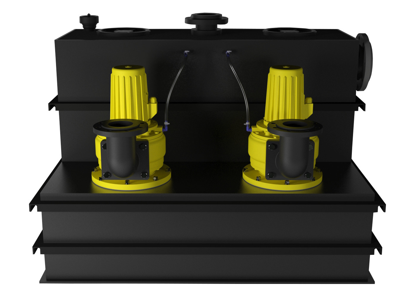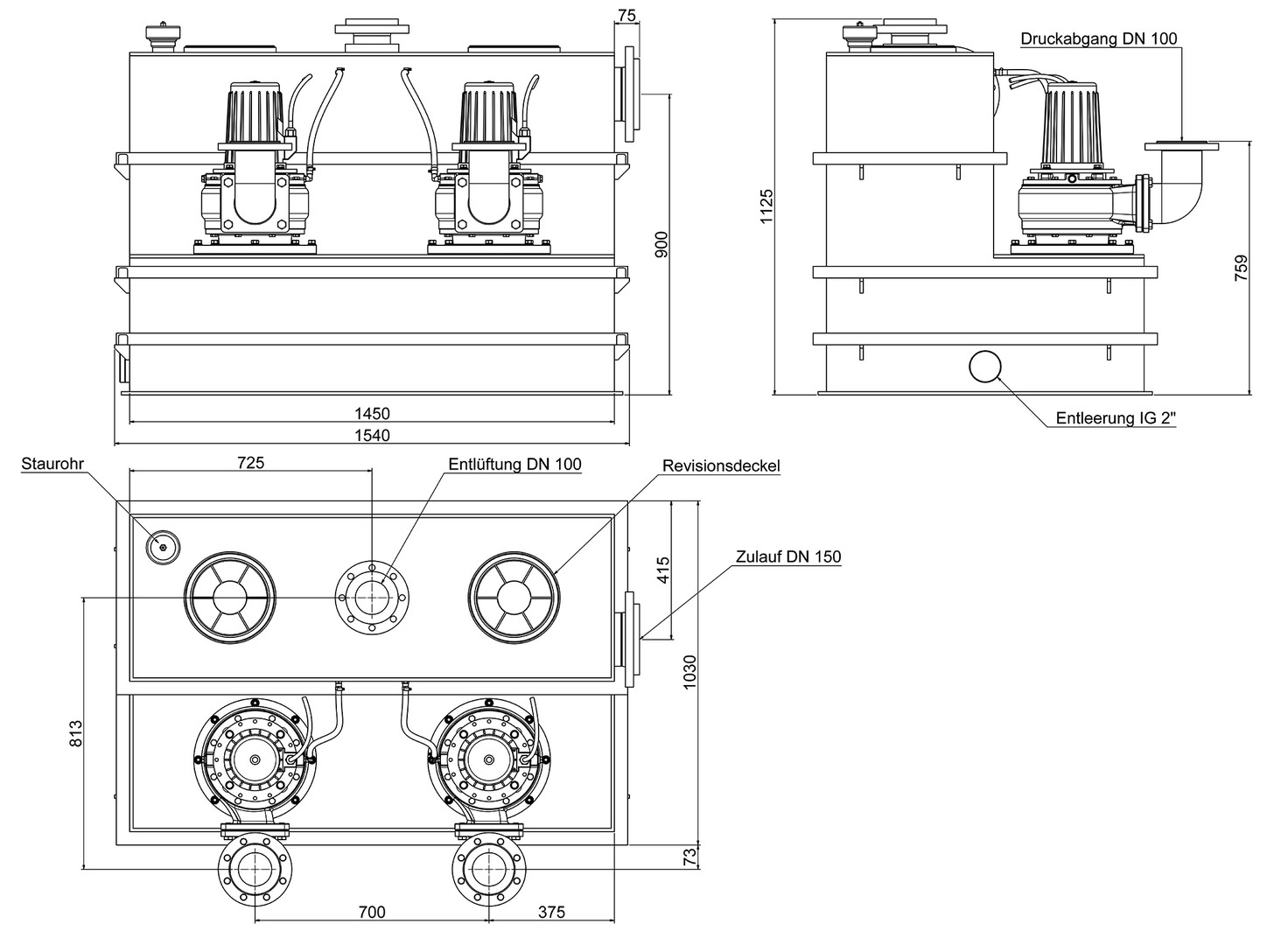 Sammelbehälter aus Polyethylen mit 1000 l Gesamtinhalt und 500 l Schaltvolumen, 2 aufgebaute Kanalradpumpen mit Faserschneidplatte mit großem freien Durchgang (80 mm/1000 mm), Abdichtung durch Gleitringdichtung (bis 4 kW) oder Hartgussdichtung (ab 5,5 kW) und Wellendichtring mit zwischenliegender Ölkammer, zusätzlicher Anschluss 1 1/2" für Handmembranpumpe, ab 7,5 kW Sterndreieckstart, Betriebsart S3 - 25%, fertig montierte Anlage mit 3,5 m Anschlusskabel zum Motor und 3,5 m Pneumatikschlauch zur Steuerung, mit ZPS2: pneumatische Niveausteuerung mit Mikrocontroller, LCD-Klartextanzeige für Füllstand/Wartung/Betriebsstunden und Störmeldungen sowie netzabhängige Alarmanlage im Schaltkasten zur Innenraummontage (7,5 kW ZPS2 Steuerung mit Sterndreieckstart), Kleinkompressorset zur Lufteinperlung, Sonderabmessungen/Sonderzuläufe und vor-Ort-Montage möglich, für Entsorgung von häuslichem Abwasser aus Mehrfamilienhäusern/Wohngebieten/Krankenhäusern/Schulen usw., Einrichtungen in denen die Abwasserentsorgung nicht unterbrochen werden darf, zur Überflurinstalllation in frostgeschützten Räumen unterhalb der Rückstauebene, 400 V, 50 Hz, Schutzart IP 57, Korngröße 80 mm, Durchmesser Einlässe DN 150, Durchmesser Abgang DN 100, Entlüftung Außen-Ø 110 mm, Medientemperatur max. 55 °C
