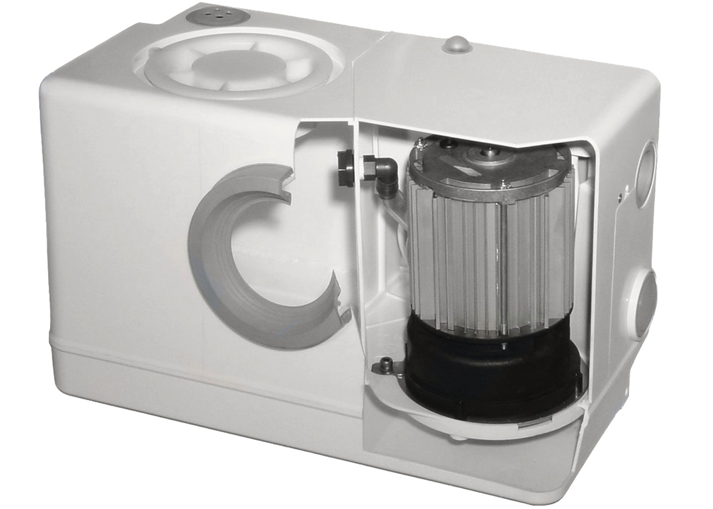 Sammelbehälter aus ABS zum Direktanschluss an EURO-Toilette mit minimaler Zulaufhöhe, 4 zusätzliche seitliche Zuläufe DN 40 zum Anschluss von Waschtisch/Dusche oder Bidet, Behälterentlüftung über Aktivkohlefilter, robuste und trocken aufgestellte Wirbelrad-Pumpe mit Schneidwerk aus Edelstahl, Alarmsignal bei Störung, Notentsorgung ist über zugänglicher Motorwelle mit Schlitz möglich, Druckabgang 1 1/4" IG mit integrierter Rückschlagklappe (wahlweise links oder rechts), mit 1,5 m Anschlusskabel mit Schutzkontaktstecker, akustischem Alarm integriert, zur begrenzten Verwendung im privaten Bereich nach EN12050-3 unterhalb der Rückstauebene, z.B. im Kellerbereich oder bei der Altbausanierung, entsorgt WC/Dusche/Waschbecken und Bidet, 230 V, 50 Hz, Schutzart IP 54, Medientemperatur max. 40 °C/kurzzeitig 90 °C