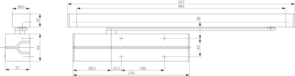 effeff Gleitschiene DC700G-E DCG-10-21; Ausführung: für Oben-Türschließer; Material: Aluminium; Türflügelanzahl: einflügelig; Funktion: elektromechanische Feststellung; Basis: Gleitschiene; Einsatzbereich: Objekttür; DIN-Richtung: DIN Links-Rechts; Montageart: Bandgegenseite,Bandseite; Ergänzung: überfahrbarer Feststellpunkt,mit Feststellung,einstellbar,mit Haltekraft,elektromechanisch; Befestigungsart: aufliegend; Türart: Feuerschutztür,Rauchschutztür; Schienenhöhe: 30mm; Schienenlänge: 527mm; Schienentiefe: 40,5mm; Betriebsspannung: 24V; Stromart Betriebsspannung: DC; Oberfläche: eloxiert; Farbton: natur; Norm: EN 1155