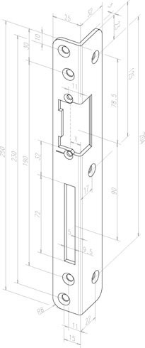 effeff 069; Produkttyp: Winkelschließblech; Produkttyp (Hersteller): Winkelschließblech; Ausfräsung: mit Fallen und Riegelausschnitt; Material: Edelstahl; Einsatzbereich: Türrahmen; Form: rund; DIN-Richtung: DIN Rechts; geeignet: Meterrissmarkierung; Farbton: edelstahl; Oberfläche: geschliffen; Schließblechbreite: 25mm; Schließblechlänge: 250mm; Schließblechtiefe: 32mm; Materialstärke: 3mm; Radius: 8°